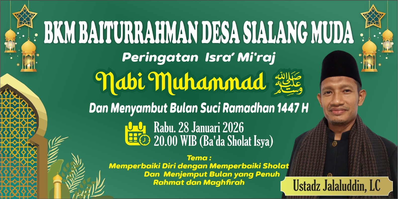 Dalam rangka memperingati peristiwa Isra’ Mi’raj Nabi Muhammad SAW, masyarakat Desa Sialang Muda, Kecamatan Hamparan Perak, menggelar pengajian akbar di Masjid Baiturrahman pada Rabu malam (28/01/26). Kegiatan dimulai pukul 21.00 WIB hingga selesai dan berlangsung dengan khidmat.