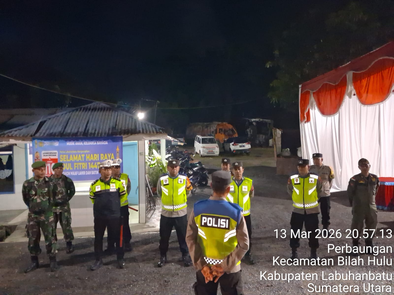 Personel Pos Pelayanan (Pos Yan) I Aek Nabara melaksanakan apel malam dalam rangka kegiatan rutin yang ditingkatkan (KRYD) Operasi Ketupat Toba 2026 untuk pengamanan perayaan Idul Fitri 1447 H / 2026 M, Jumat (13/3/2026) malam.