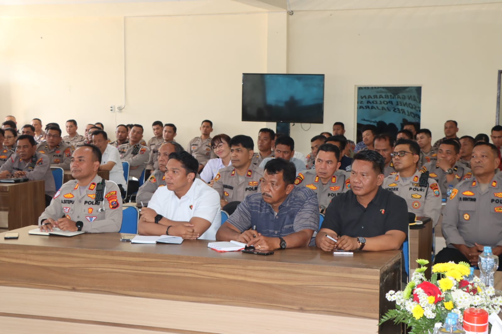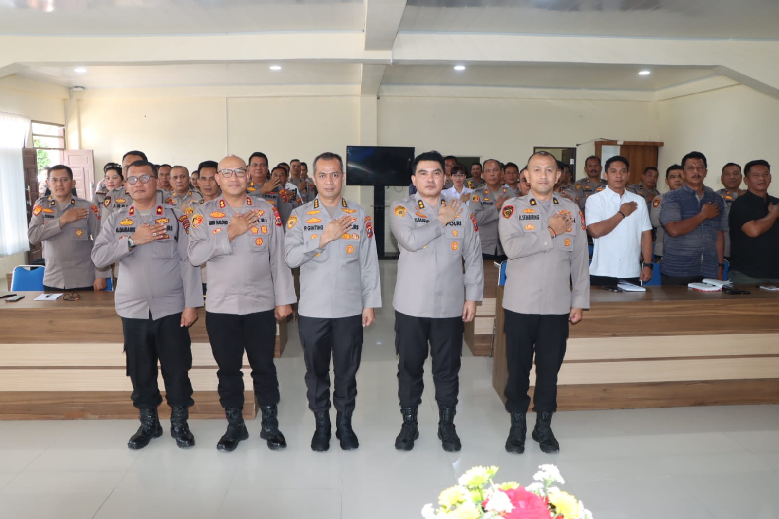 Turut hadir dalam kegiatan tersebut Kapolres Tanah Karo AKBP Pebrinadi Haloho, S.H., S.I.K., M.Si., Wakapolres Tanah Karo Kompol Gering Damanik, S.H., para pejabat utama Polres Tanah Karo, para Kapolsek, perwira, serta seluruh personel Polres Tanah Karo.