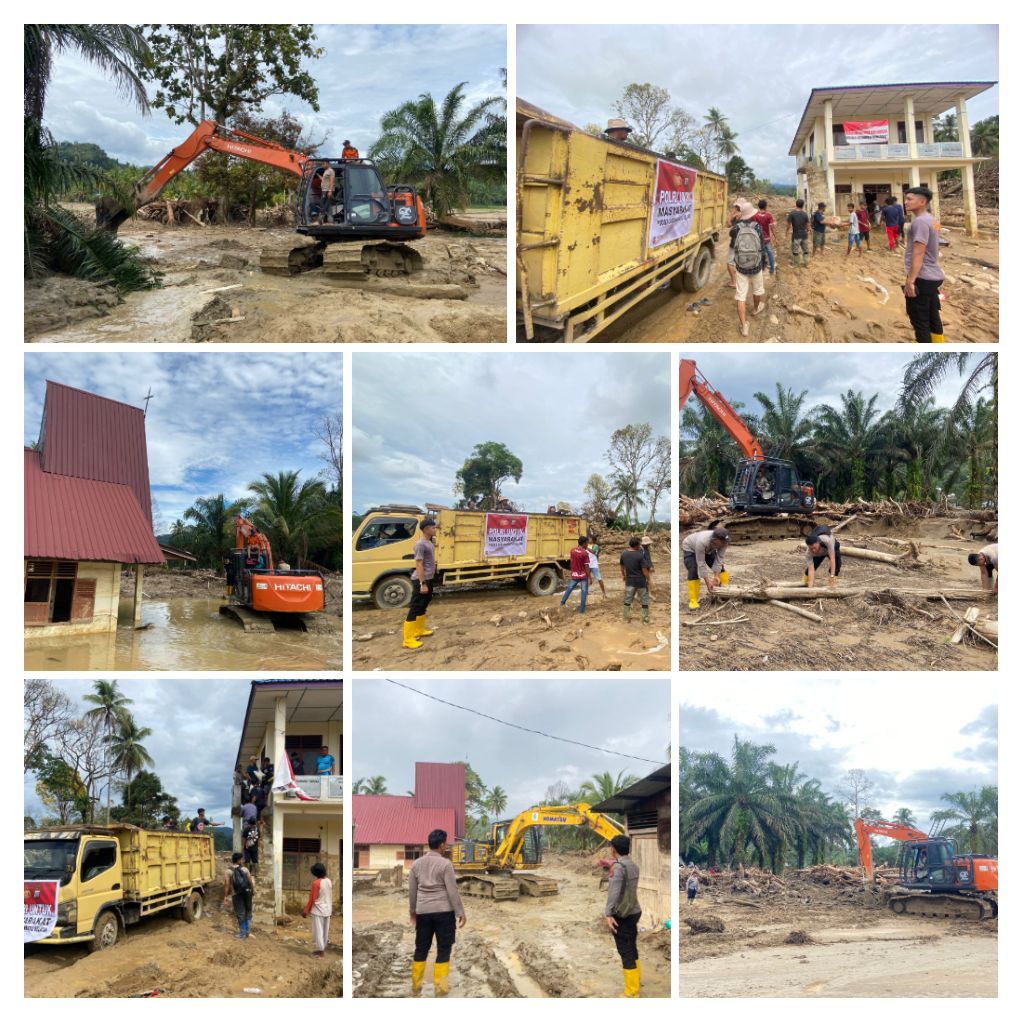 Dalam operasi kemanusiaan ini, personel Polres Labuhanbatu Selatan di bawah kepemimpinan Kabag Log AKP Mulyadi, S.H., mendirikan tenda pleton polisi, tenda pantau BPBD, serta dapur umum untuk mendukung logistik dan kebutuhan personel di lokasi bencana. Pembersihan dilakukan secara intensif menggunakan dua unit alat berat jenis beko, dibantu personel yang bekerja manual dengan cangkul, sekop, dan angkong.