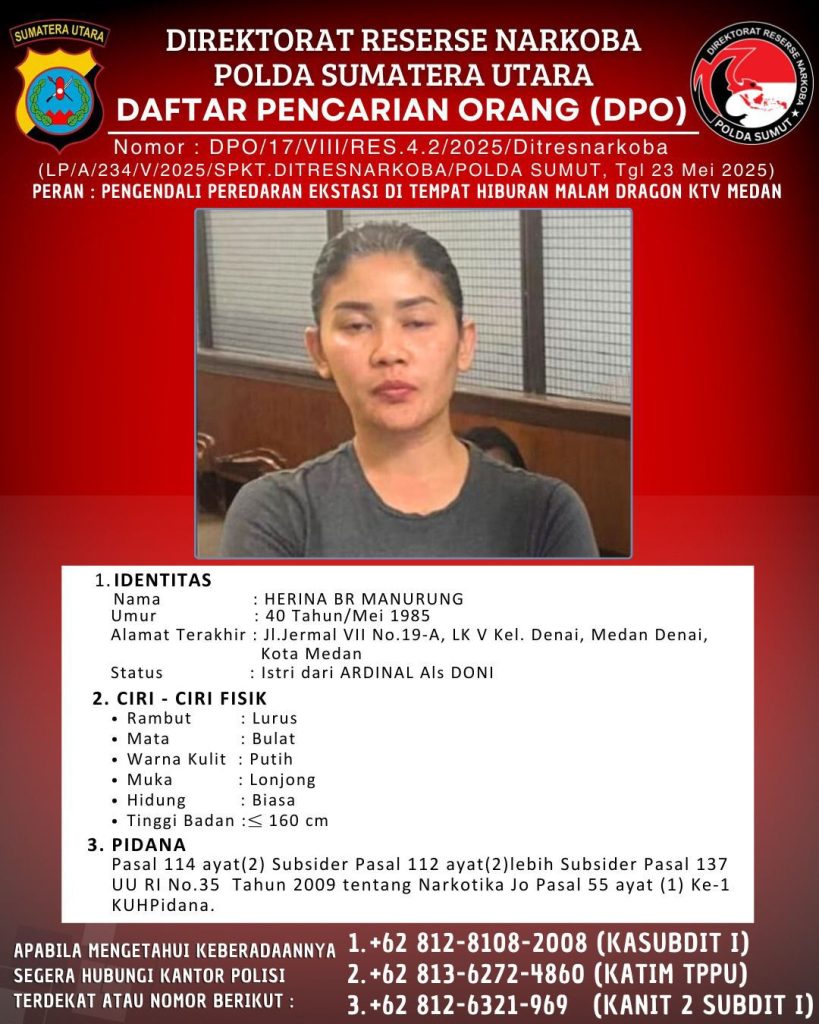 Medan, 2 September 2025 – Blusuk.online – Direktorat Reserse Narkoba Polda Sumatera Utara menetapkan seorang perempuan bernama Herina Br Manurung sebagai Daftar Pencarian Orang (DPO) atas dugaan keterlibatan dalam jaringan peredaran narkotika jenis ekstasi di tempat hiburan malam Dragon KTV Medan.