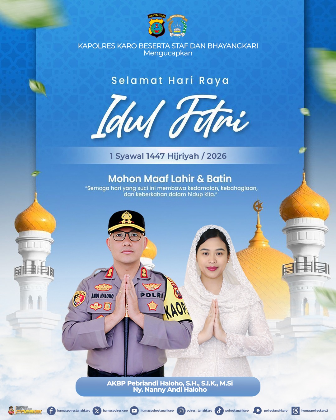 Ucapan tersebut disampaikan sebagai bentuk kepedulian dan kedekatan Polri dengan masyarakat, khususnya dalam momentum hari besar keagamaan yang penuh makna. Kapolres Karo, AKBP Pebriandi Haloho, S.H., S.I.K., M.Si, didampingi Ketua Bhayangkari Cabang Karo, Ny. Nanny Andi Haloho, mengajak seluruh masyarakat untuk menjadikan Idul Fitri sebagai ajang mempererat tali silaturahmi.