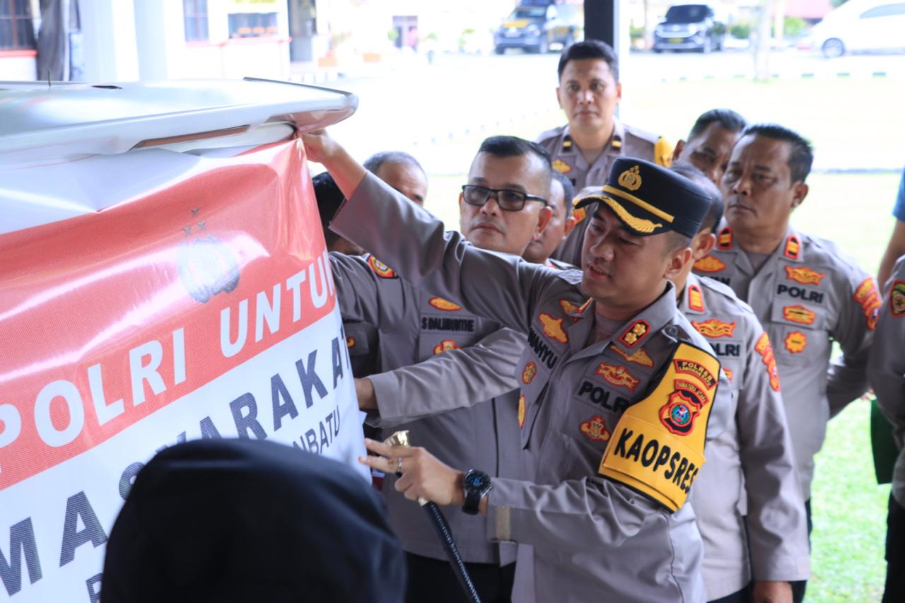 Kapolres turut memasang stiker bertuliskan “Polri untuk Masyarakat” serta lampu rotator sesuai peruntukan pada kendaraan ambulans.