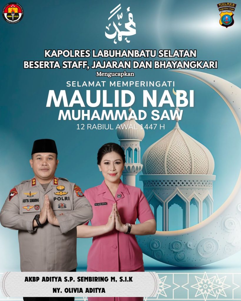 Kapolres Labuhanbatu Selatan, AKBP Aditya S.P. Sembiring Muham, S.I.K., bersama jajaran staf dan Bhayangkari, menyampaikan ucapan selamat memperingati Maulid Nabi Muhammad SAW 1447 Hijriah, yang jatuh pada 12 Rabiul Awal 1447 H / 5 September 2025.