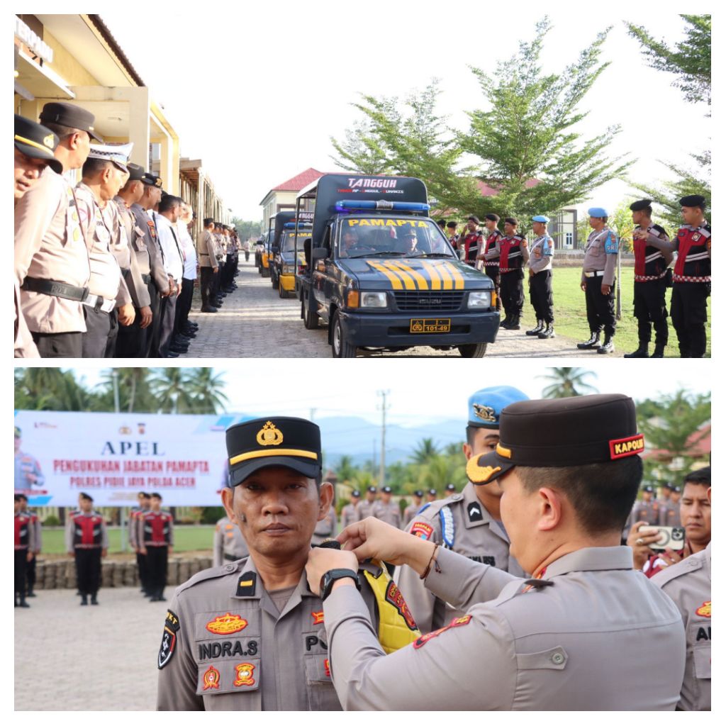 Apel pengukuhan tersebut turut dihadiri oleh Wakapolres Pidie Jaya Kompol Iswahyudi, S.H., CPHR., CBA., Kabag SDM AKP Mahyuddin, S.H., M.M., para Pejabat Utama, Kapolsek jajaran, serta seluruh personel Polres dan Polsek Pidie Jaya.
