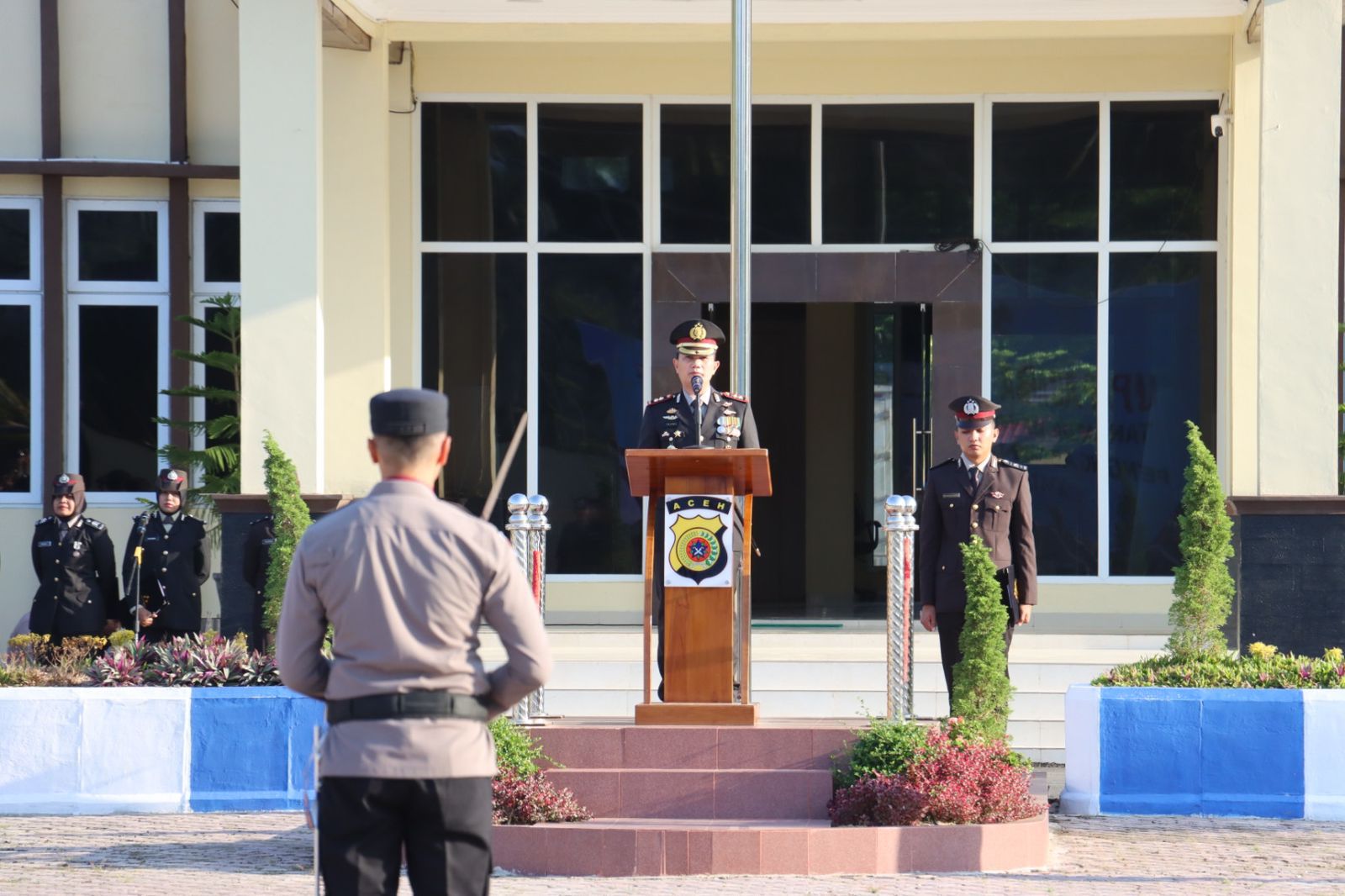 Dalam upacara tersebut, Kabag SDM Polres Pidie Jaya AKP Mahyudin bertindak sebagai Perwira Upacara, sementara Komandan Upacara dipercayakan kepada IPDA Dedi Irvansyah dari Pamapta 3 Polres Pidie Jaya.