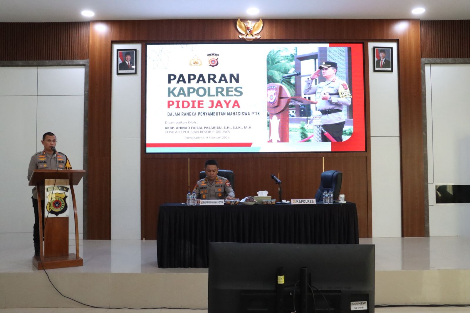 Kapolres Pidie Jaya AKBP Ahmad Faisal Pasaribu menyambut kedatangan Mahasiswa Sekolah Tinggi Ilmu Kepolisian (STIK) Angkatan ke-83 Widya Parama Satwika dalam kegiatan yang digelar di Aula Tathya Dharaka Polres Pidie Jaya, Senin (10/2/2026).