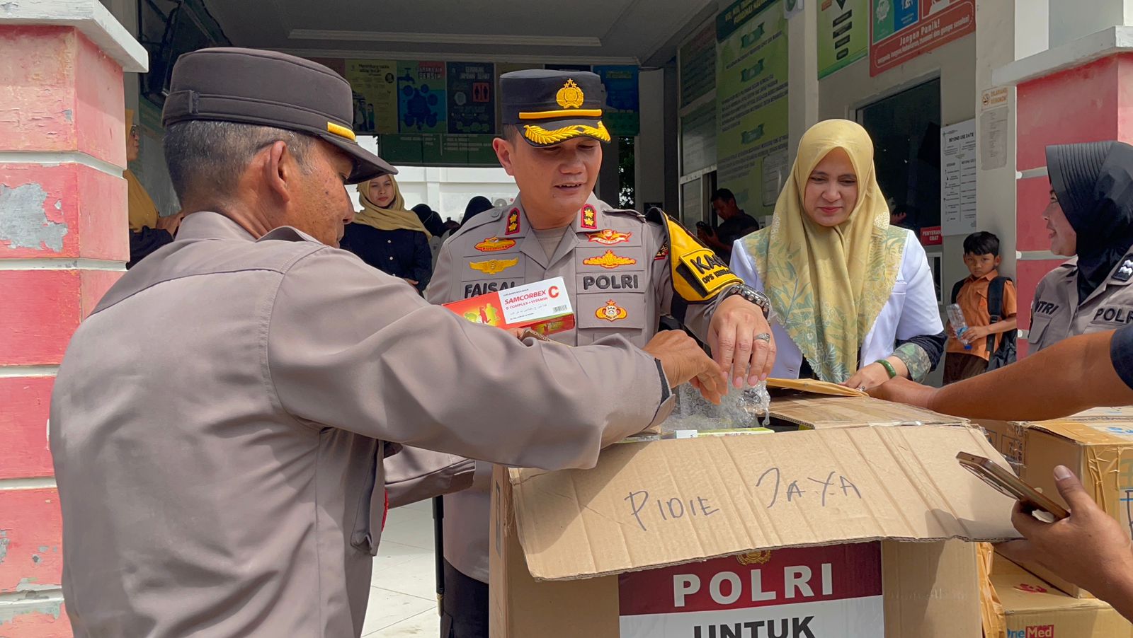 Kapolres Pidie Jaya, AKBP Ahmad Faisal Pasaribu, menyerahkan bantuan obat-obatan dari Kapolda Aceh, Irjen Pol. Marzuki Ali Basyah, kepada masyarakat terdampak banjir di Kecamatan Meureudu, Kabupaten Pidie Jaya, Jumat (13/02/2026) pukul 11.00 WIB.