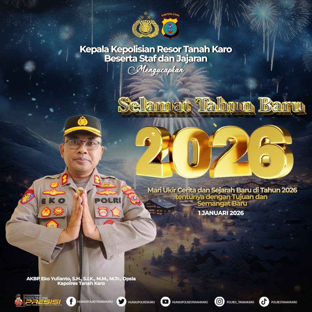 KARO – Blusuk.online – Kapolres Tanah Karo beserta seluruh staf dan jajaran mengucapkan Selamat Tahun Baru 2026 kepada seluruh masyarakat Kabupaten Karo. Ucapan tersebut disampaikan sebagai bentuk doa dan harapan agar tahun yang baru membawa semangat baru, kedamaian, serta kesuksesan bagi semua pihak.