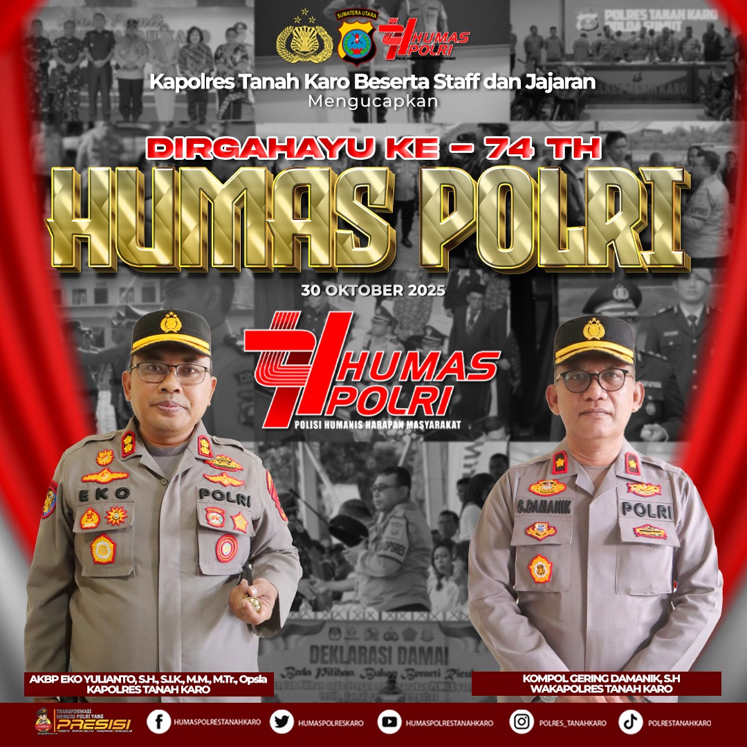 Tanah Karo, 30 Oktober 2025 – Blusuk.online – Dalam rangka memperingati Hari Jadi ke-74 Humas Polri, Kapolres Tanah Karo, AKBP Eko Yulianto, S.H., S.I.K., M.H., M.Tr.Opsla, beserta seluruh staf dan jajaran Polres Tanah Karo, menyampaikan ucapan selamat kepada Humas Polri.