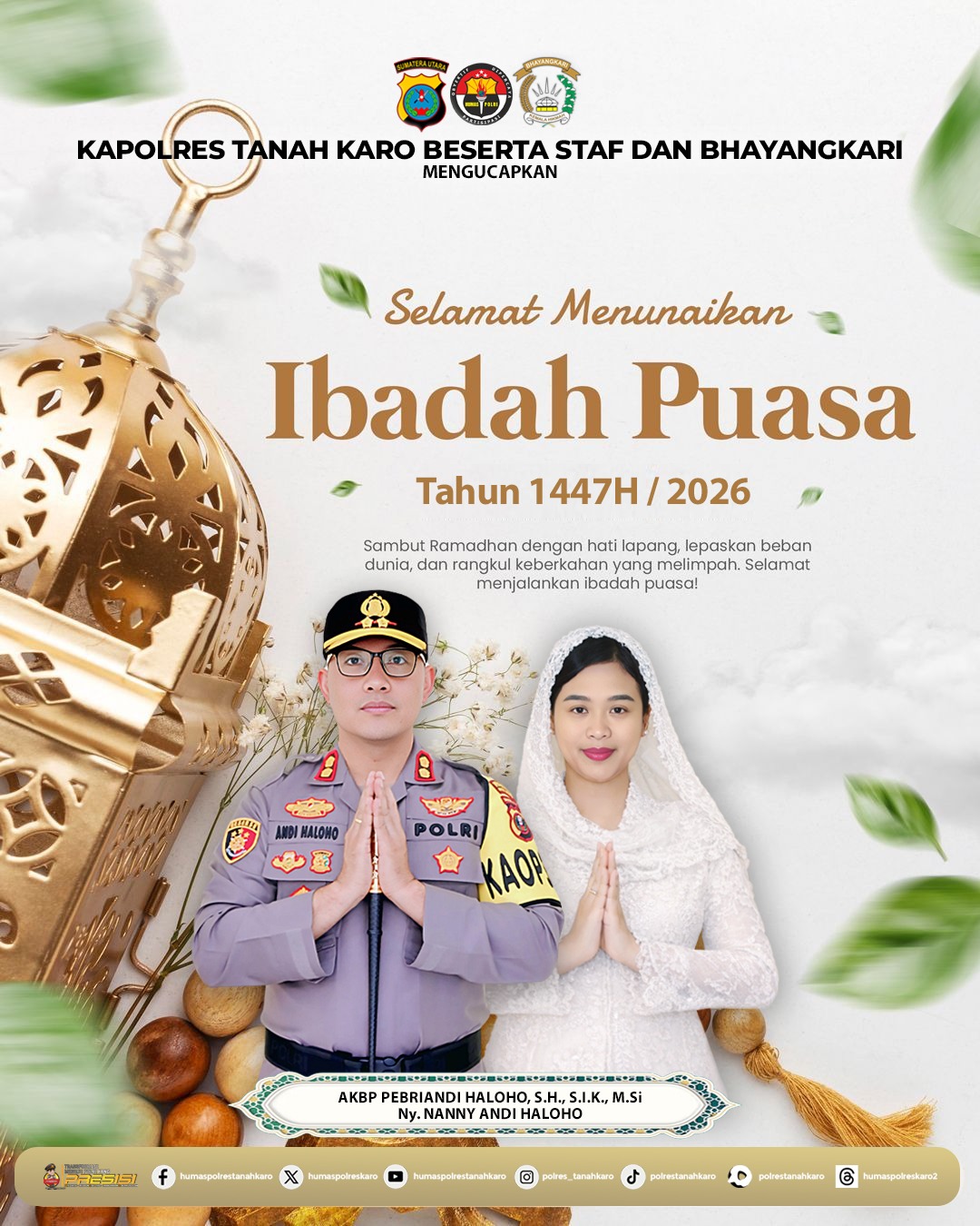 Marhaban ya Ramadan. Atas nama pribadi, keluarga, dan seluruh jajaran Polres Tanah Karo, kami mengucapkan Selamat Menunaikan Ibadah Puasa 1447 H. Semoga Ramadan kali ini membawa keberkahan, kedamaian, dan memperkuat persaudaraan di tengah masyarakat,” ujarnya.