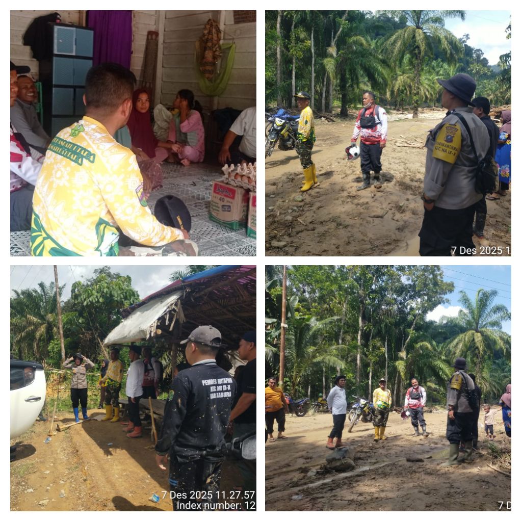 Polsek Na IX-X Polres Labuhanbatu menunjukkan respons cepat dan kepedulian terhadap masyarakat yang terdampak luapan Sungai Hatapang. Kapolsek Na IX-X, AKP Yustina, S.H., M.H., bersama Wakil Bupati Labuhanbatu Utara, Dr. H. Samsul Tanjung, ST., MH., melakukan peninjauan langsung ke Dusun 1, Desa Hatapang, Kecamatan Na IX-X, pada Minggu (07/12/2025). Kegiatan ini dilakukan untuk memastikan situasi terkini dan kebutuhan warga pasca banjir yang terjadi pada Sabtu malam.