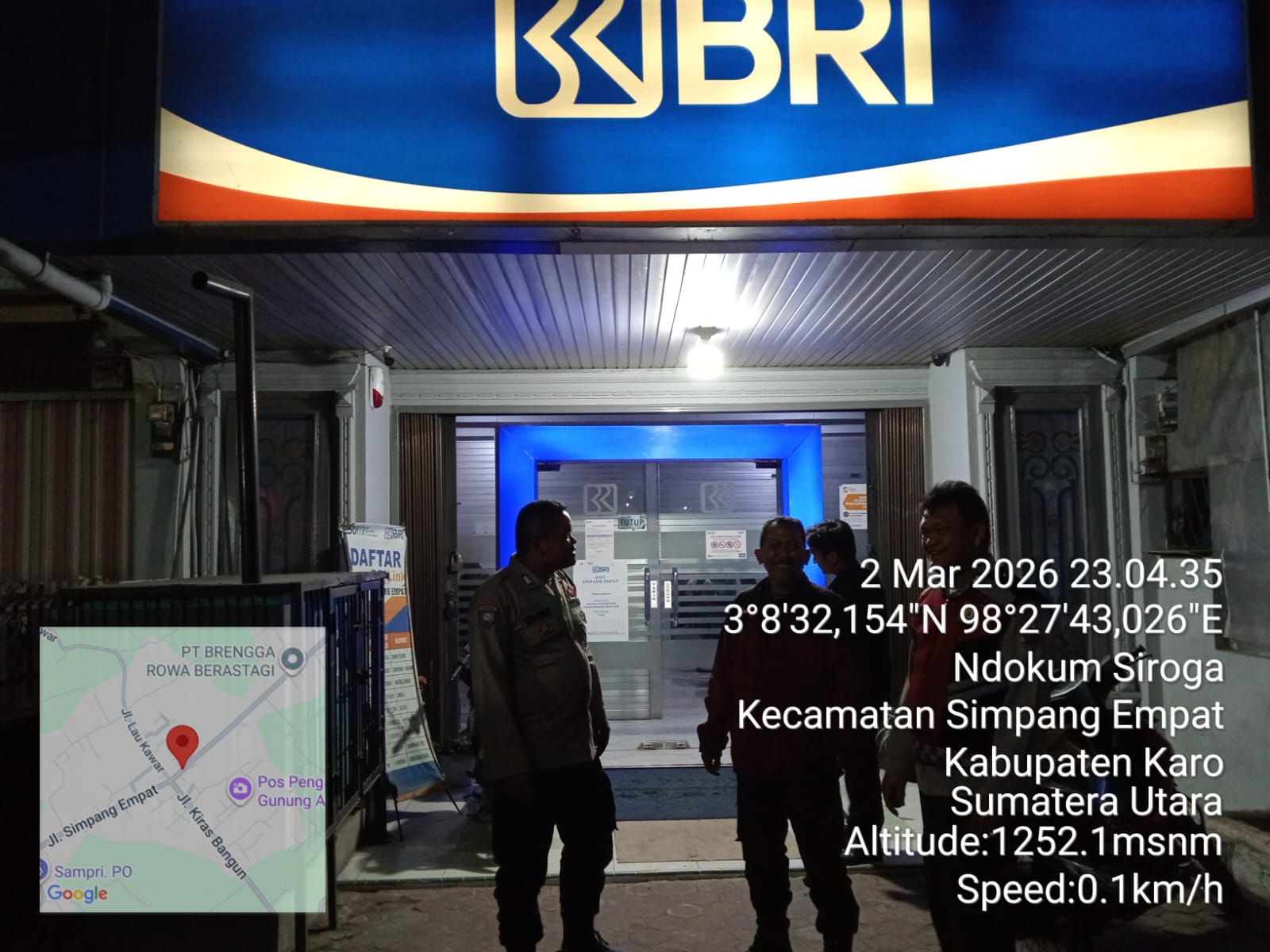 Kegiatan patroli tersebut dilaksanakan oleh AIPTU F. Sitepu dan BRIPKA J. Ginting dengan menggunakan mobil dinas patroli. Adapun rute yang dilalui dimulai dari Mako Polsek Simpang Empat, menyusuri Jalan Gajah, menuju BRI Unit Simpang Empat, kemudian kembali ke mako.