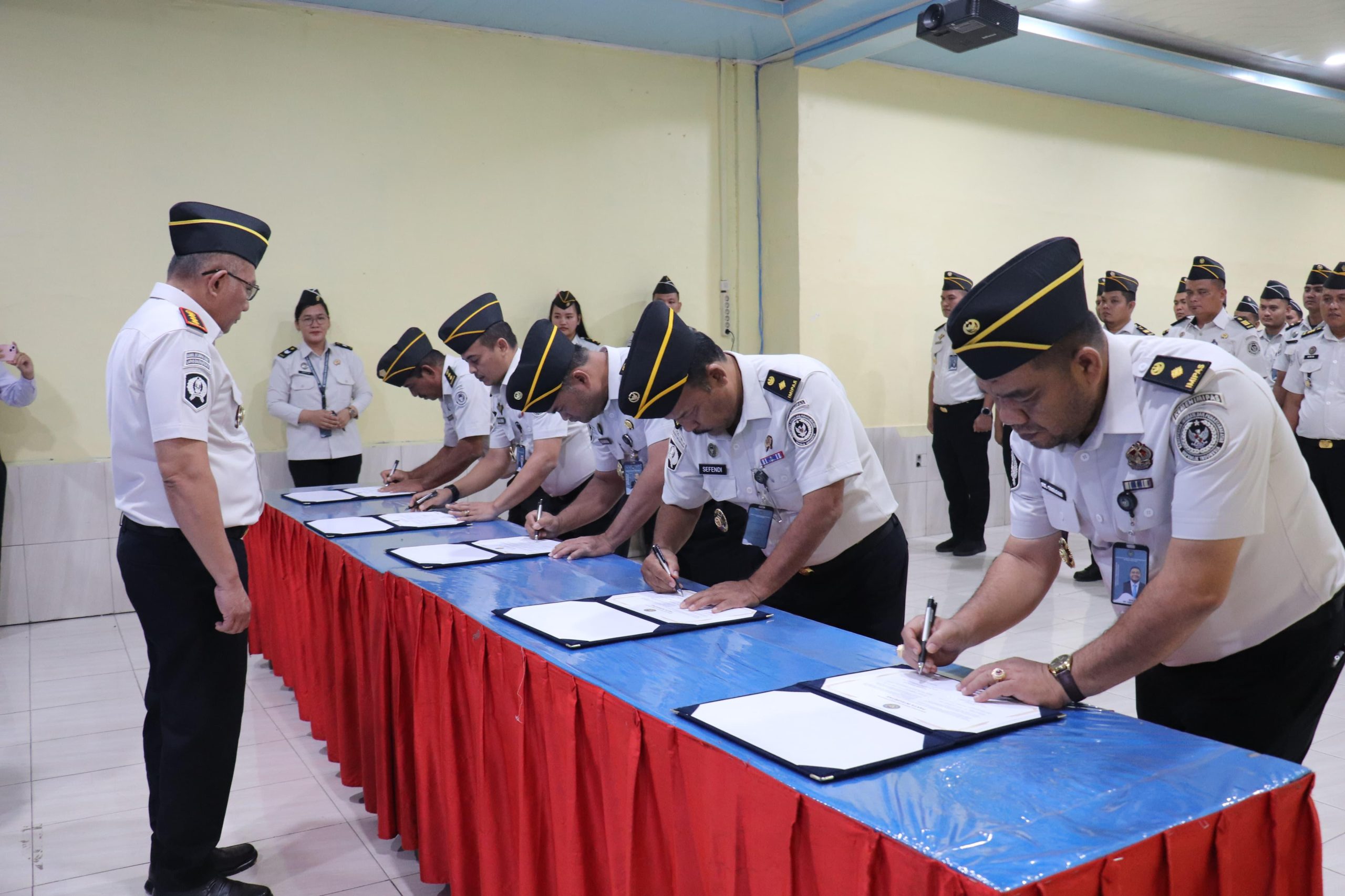 Acara berlangsung dengan penuh khidmat dan semangat kebersamaan. Seluruh unsur pegawai turut ambil bagian, mulai dari Pejabat Eselon IV dan V, Pejabat Fungsional Tertentu (JFT), staf pelaksana, hingga CPNS Lapas Rantauprapat. Perwakilan masing-masing unsur secara bergantian membubuhkan tanda tangan sebagai simbol tanggung jawab dan komitmen kolektif dalam pembangunan Zona Integritas.