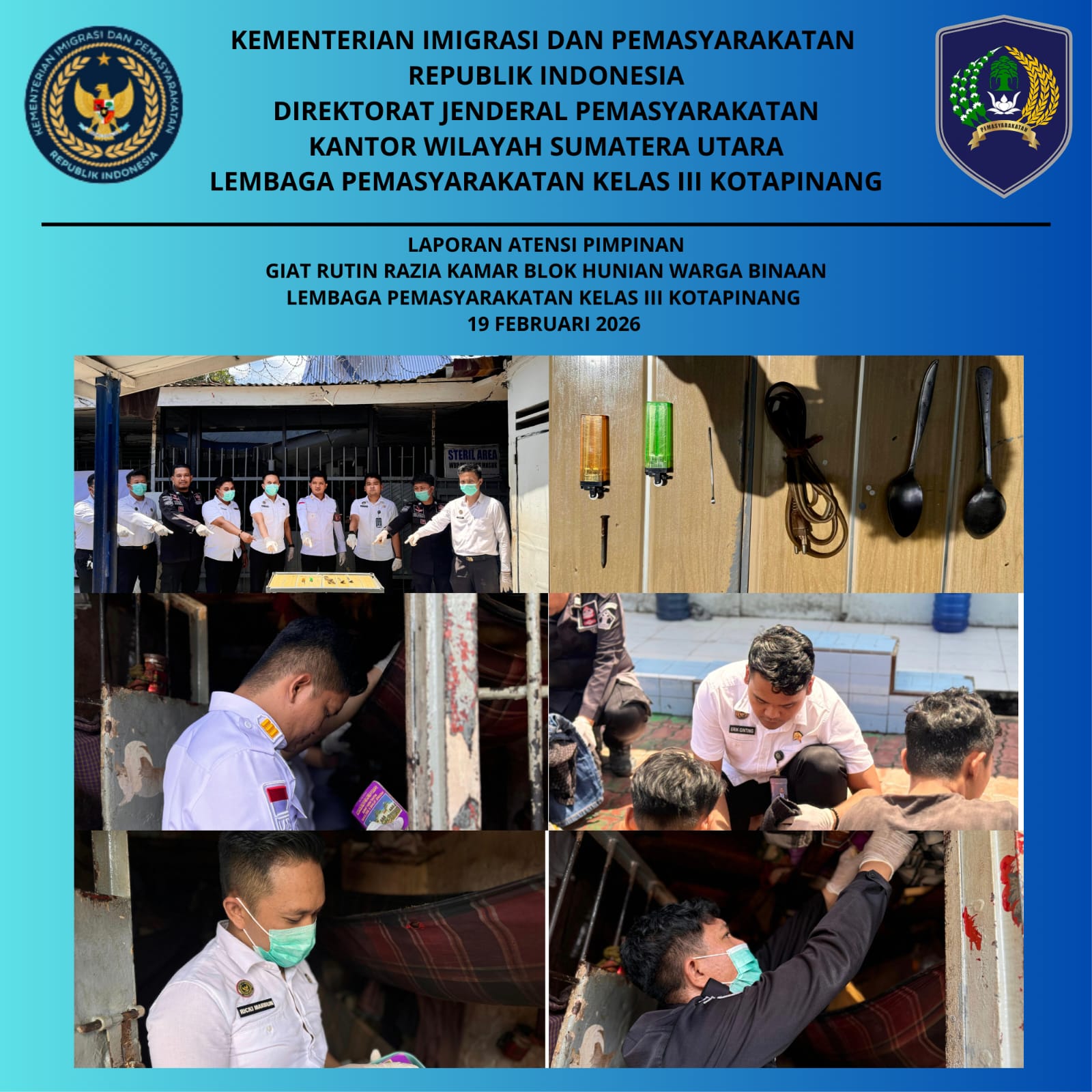 Kotapinang – Blusuk.online – Dalam rangka deteksi dini gangguan keamanan dan ketertiban (kamtib), petugas Lapas Kelas III Kotapinang melaksanakan penggeledahan kamar hunian Warga Binaan Pemasyarakatan (WBP) di Kamar 02 Blok B, Kamis (19/2/2026) pukul 13.00 WIB hingga selesai.