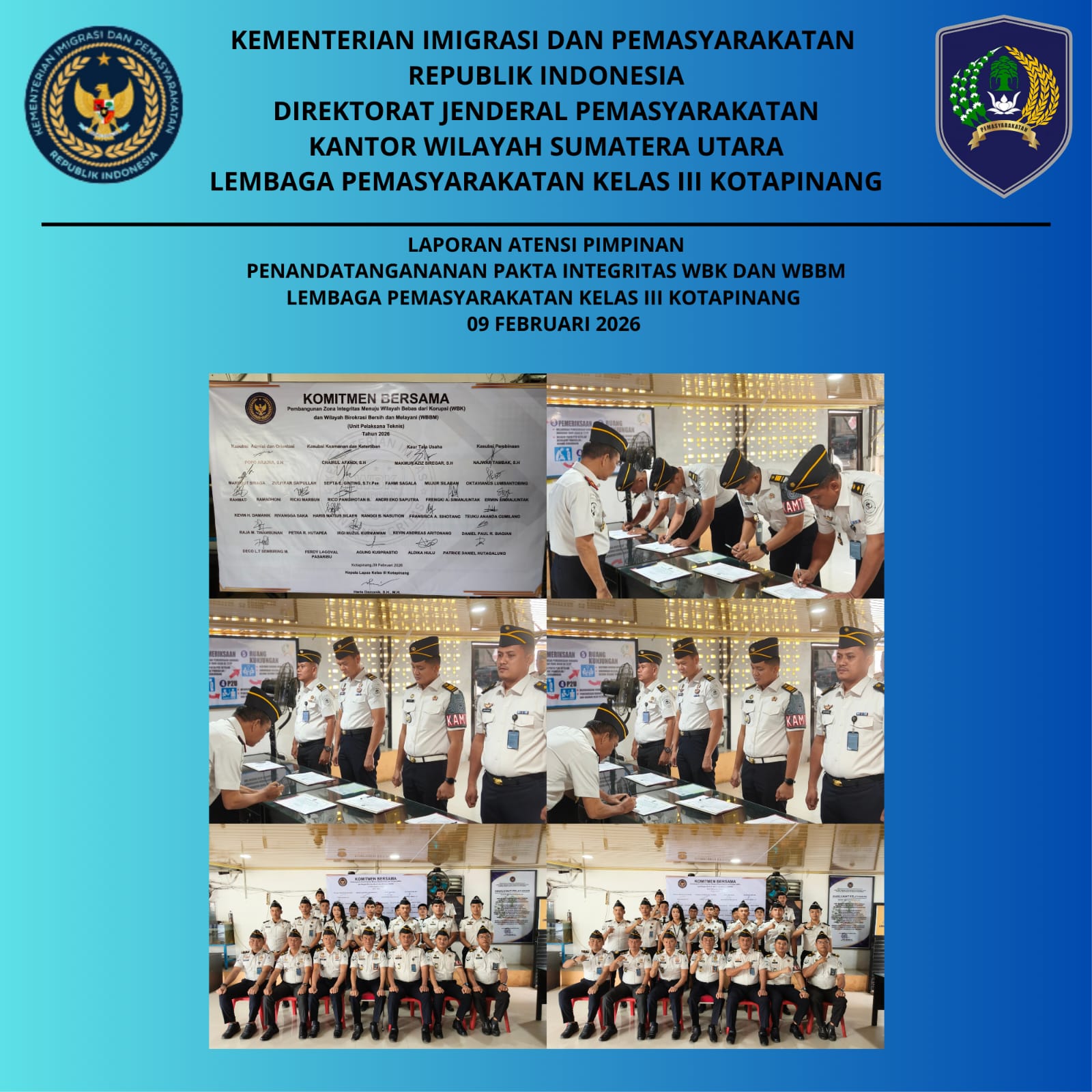 Lembaga Pemasyarakatan (Lapas) Kelas III Kotapinang melaksanakan penandatanganan Pakta Integritas Pembangunan Zona Integritas menuju Wilayah Bebas dari Korupsi (WBK) dan Wilayah Birokrasi Bersih dan Melayani (WBBM), Senin (09/02/2026), bertempat di Lapas Kelas III Kotapinang.