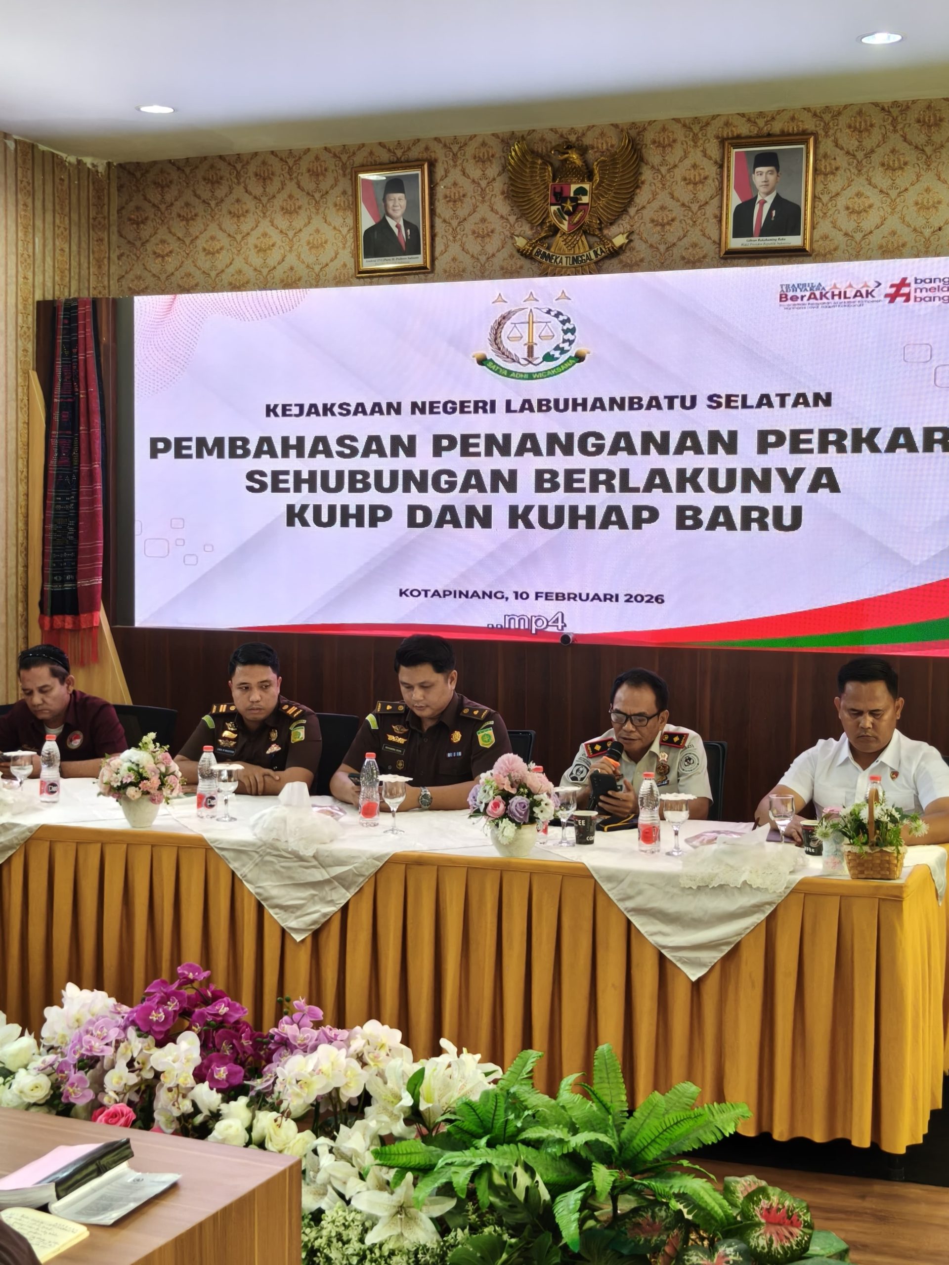 Kepala Lapas Kelas III Kotapinang, Haris Damanik, S.H., M.H., didampingi Kasubsi AO dan staf, mengikuti diskusi dan pembahasan bersama jajaran Kejari Labuhanbatu Selatan yang turut dihadiri Kasat Reskrim Polres Labuhanbatu Selatan. Pertemuan ini dilaksanakan sebagai bentuk koordinasi dan penguatan sinergi antar aparat penegak hukum dalam menghadapi masa transisi pemberlakuan regulasi baru di bidang hukum pidana.