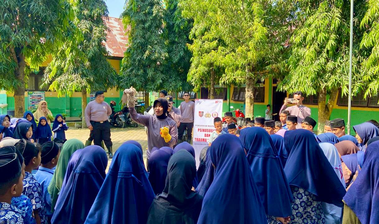 Mahasiswa STIK Lemdiklat Polri Angkatan 83/Widya Pratama Satwika (WPS) melaksanakan kegiatan trauma healing kepada siswa/i MIN Kuta Batee, Sabtu (14/2/2026), di wilayah Polres Pidie Jaya, Kecamatan Meureudu, Kabupaten Pidie Jaya.