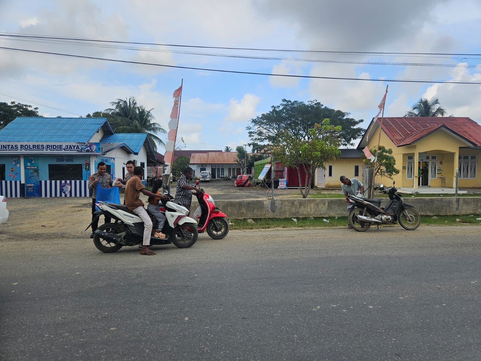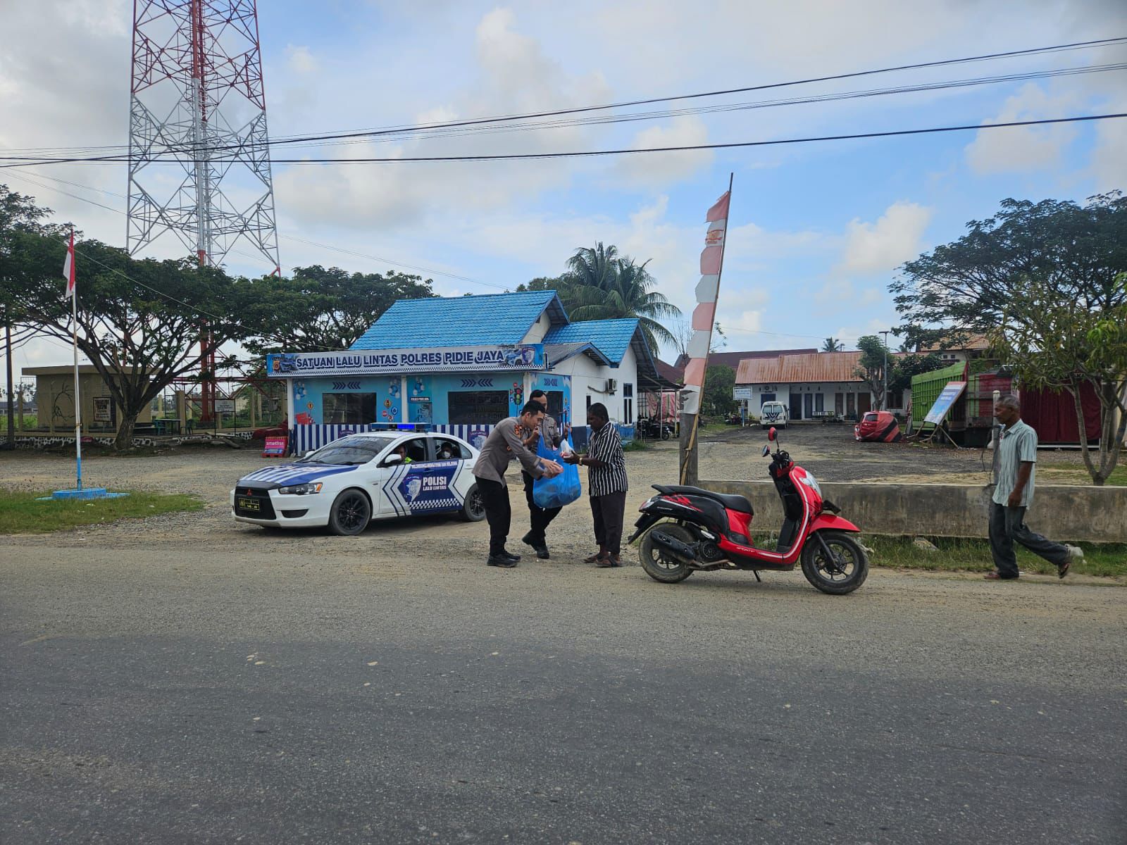 Pada sore hari, kegiatan dilanjutkan dengan pembagian takjil kepada pengguna jalan di depan Pos Lantas Pidie Jaya sebagai bentuk kepedulian di bulan suci Ramadhan 1447 H.