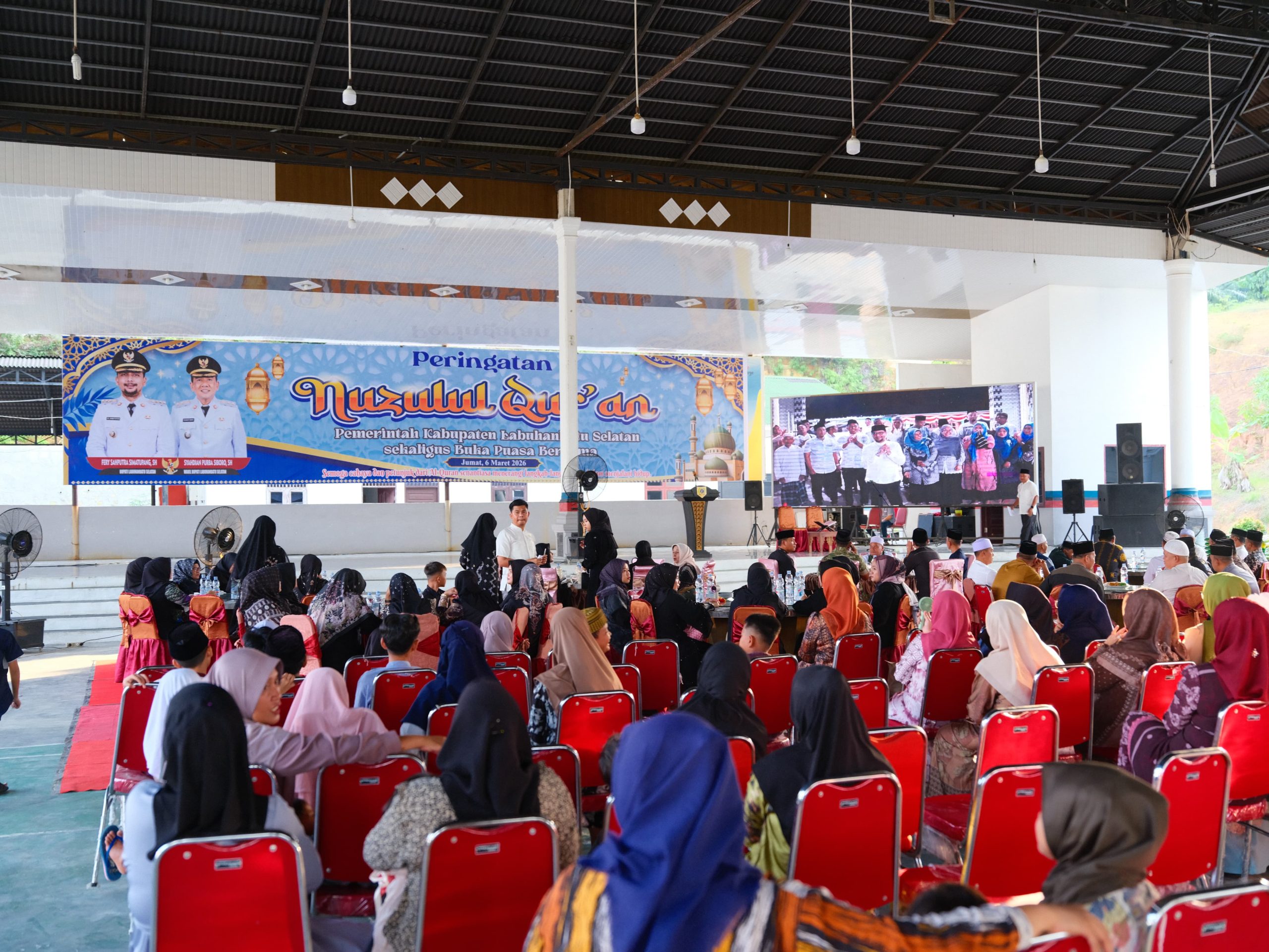 Pemerintah Kabupaten Labuhanbatu Selatan (Labusel) menggelar peringatan Nuzulul Qur’an 1447 Hijriah yang dirangkai dengan kegiatan buka puasa bersama di Pendopo Rumah Dinas Bupati Labusel, Jumat (6/3/2026).