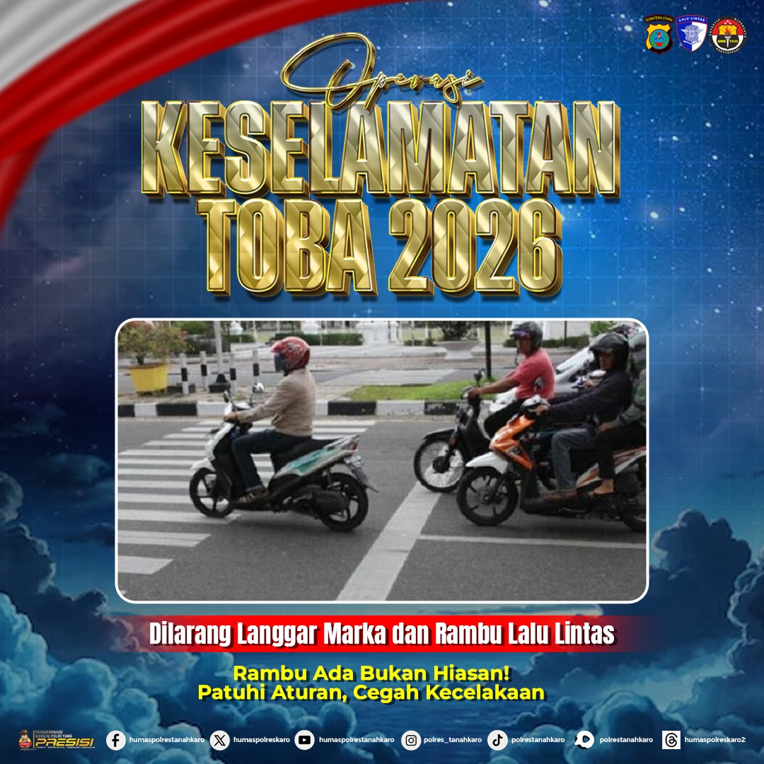 Polres Tanah Karo mengajak seluruh elemen masyarakat untuk bersama-sama mendukung Operasi Keselamatan Toba 2026 dengan menjadi pelopor keselamatan berlalu lintas. Tertib di jalan raya merupakan wujud tanggung jawab bersama demi terciptanya keamanan, keselamatan, ketertiban, dan kelancaran lalu lintas yang kondusif.