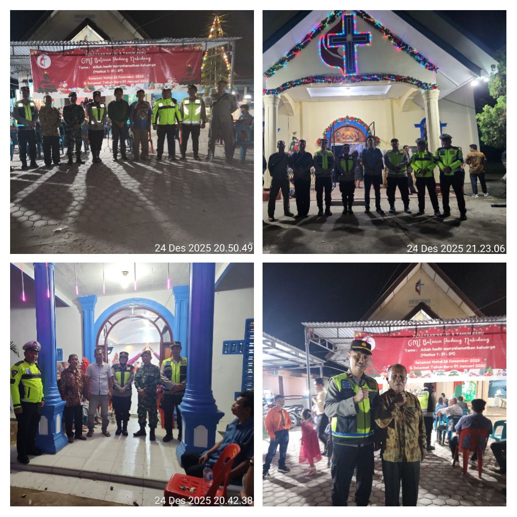Guna memastikan keamanan dan kenyamanan umat Kristiani dalam melaksanakan ibadah Malam Natal 2025, personel Pos Pelayanan (Pos Yan) 3 Kampung Pajak melaksanakan patroli dan pengamanan di sejumlah gereja yang berada di wilayah hukum Polsek Na IX-X, Kabupaten Labuhanbatu Utara, Rabu (24/12/2025).