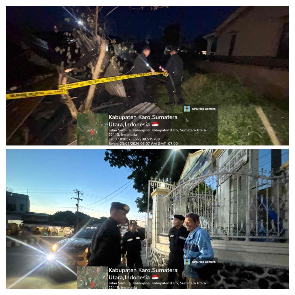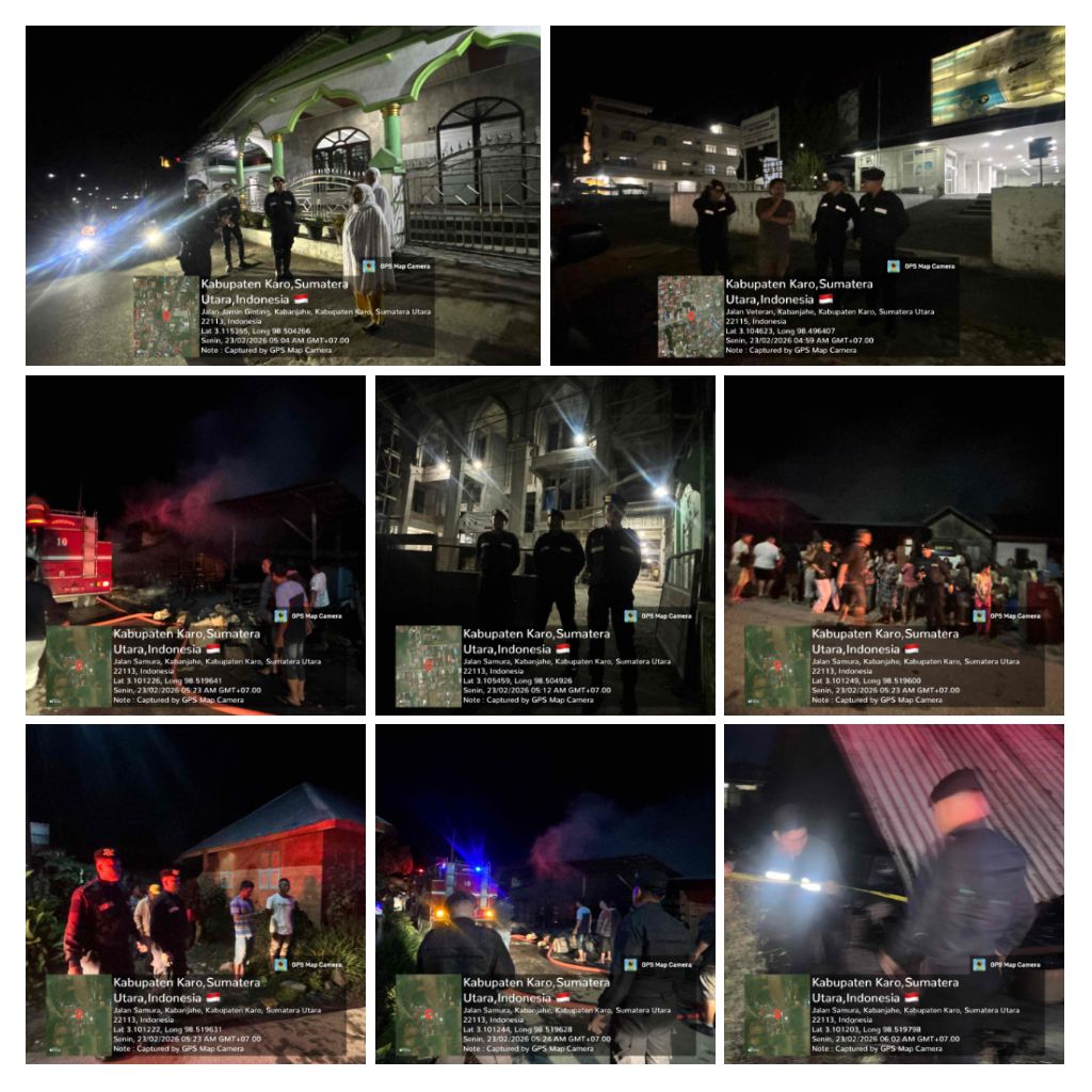KARO – Blusuk.online – Personel Satuan Samapta Polres Tanah Karo menunjukkan kesigapan saat menangani peristiwa kebakaran yang menghanguskan satu unit kedai kopi di Desa Lepar Samura, Kecamatan Tigapanah, Kabupaten Karo, Senin (23/2/2026) dini hari.