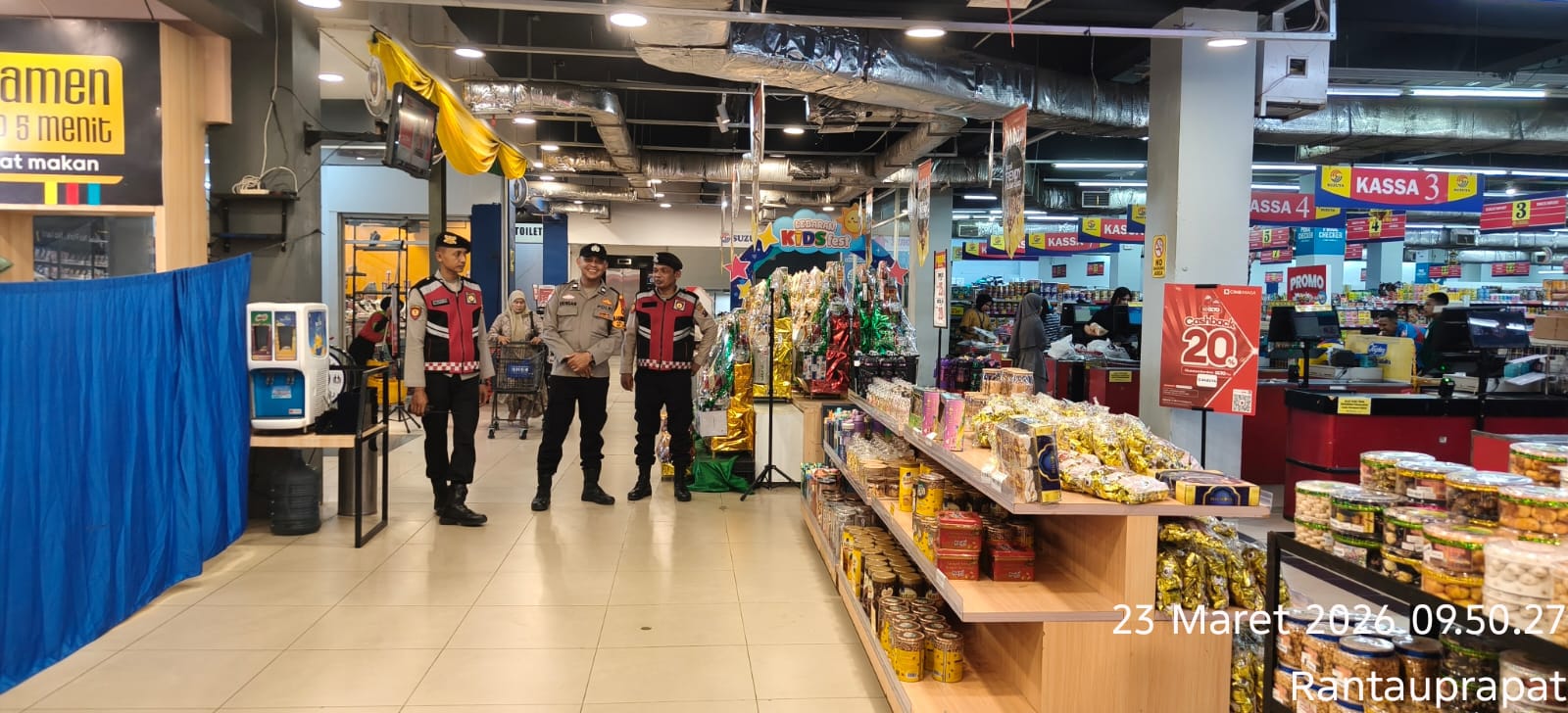 polreslabuhanbatu – Blusuk.online – Dalam rangka menciptakan situasi kamtibmas yang aman dan kondusif menjelang perayaan Idul Fitri 1447 H, Satuan Samapta Polres Labuhanbatu melaksanakan patroli rutin menggunakan kendaraan roda empat (R4) di sejumlah titik rawan kriminalitas dan pusat aktivitas masyarakat di Kota Rantauprapat, Senin (23/3/2026).