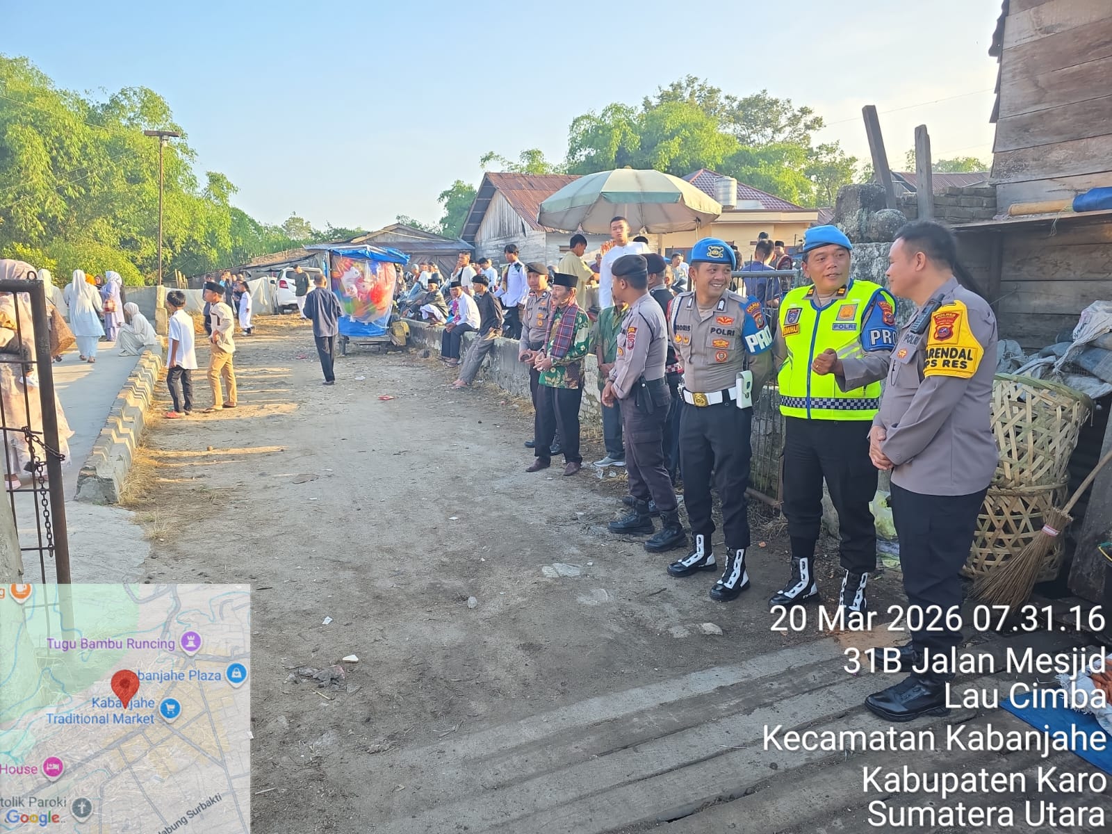 Kegiatan Sholat Idul Fitri dilaksanakan di kawasan Kilang Padi Randal, Jalan Masjid, Kelurahan Lau Cimba, Kecamatan Kabanjahe. Sejak pagi hari, personel kepolisian telah disiagakan di sekitar lokasi untuk mengatur arus lalu lintas serta menjaga situasi kamtibmas agar tetap kondusif.