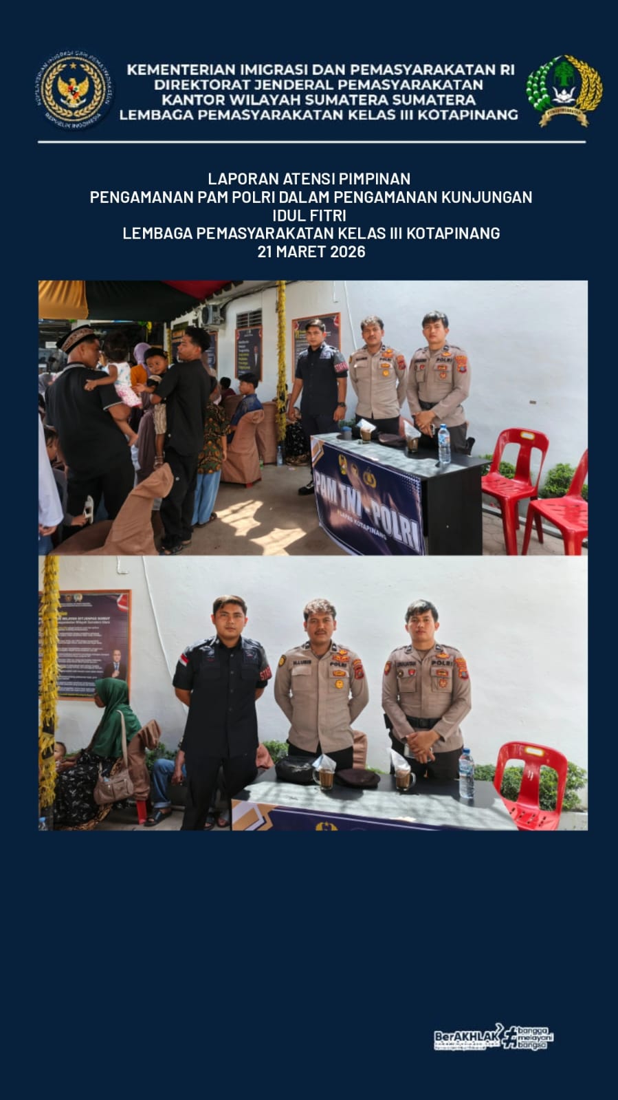 Lembaga Pemasyarakatan (Lapas) Kelas III Kotapinang melaksanakan pengamanan kegiatan kunjungan Hari Raya Idul Fitri pada Sabtu, 21 Maret 2026, mulai pukul 09.00 WIB hingga selesai.