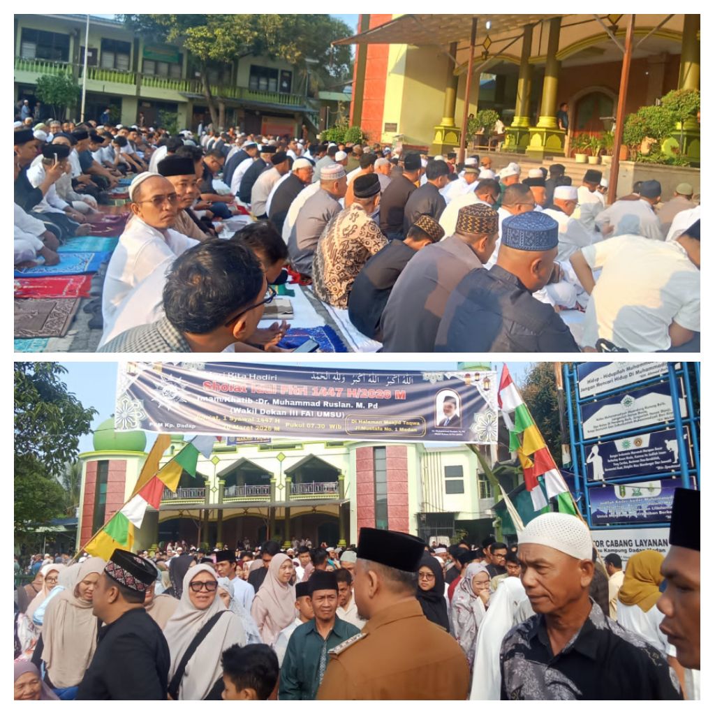 Dalam rangka menyambut 1 Syawal 1447 H yang bertepatan pada Jumat, 20 Maret 2026, Pimpinan Cabang Muhammadiyah (PCM) Kampung Dadap akan menyelenggarakan Shalat Idul Fitri 1447 H pada pukul 07.30 WIB. Kegiatan ini akan dilaksanakan di pelataran halaman Masjid Taqwa, Jalan Mustafa, Kelurahan Glugur Darat I, Kecamatan Medan Timur.