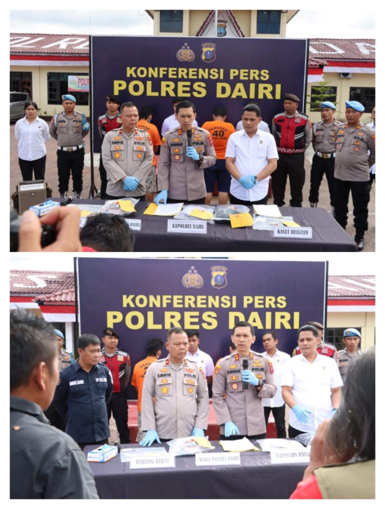 Dalam Konferensi Pers di Halaman Mapolres Dairi, AKBP Otniel Siahaan, S.I.K., M.I.K Menerangkan Terdapat 2 Orang Tersangka dengan Kasus yang Berbeda, dengan masing-masing Tersangka Berinisial REN dan RK.