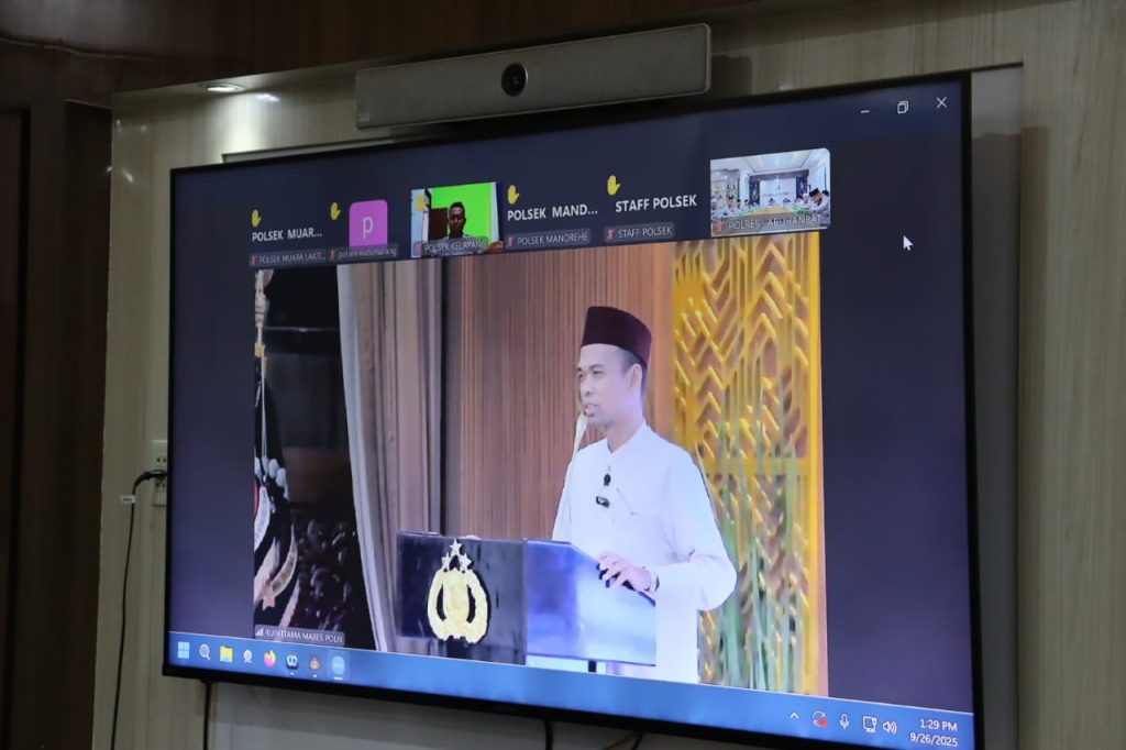Kegiatan tersebut menghadirkan ceramah dari penceramah nasional, Ustadz Prof. K.H. Abdul Somad, Lc., D.E.S.A., Ph.D., yang disampaikan secara langsung (live streaming) dari Mabes Polri. Dalam tausiyahnya, Ustadz Abdul Somad memberikan penguatan iman, nasihat akhlak, serta motivasi spiritual kepada seluruh anggota kepolisian yang mengikuti kegiatan tersebut.