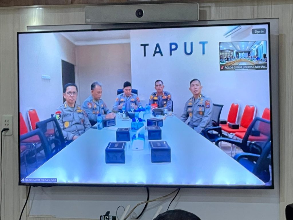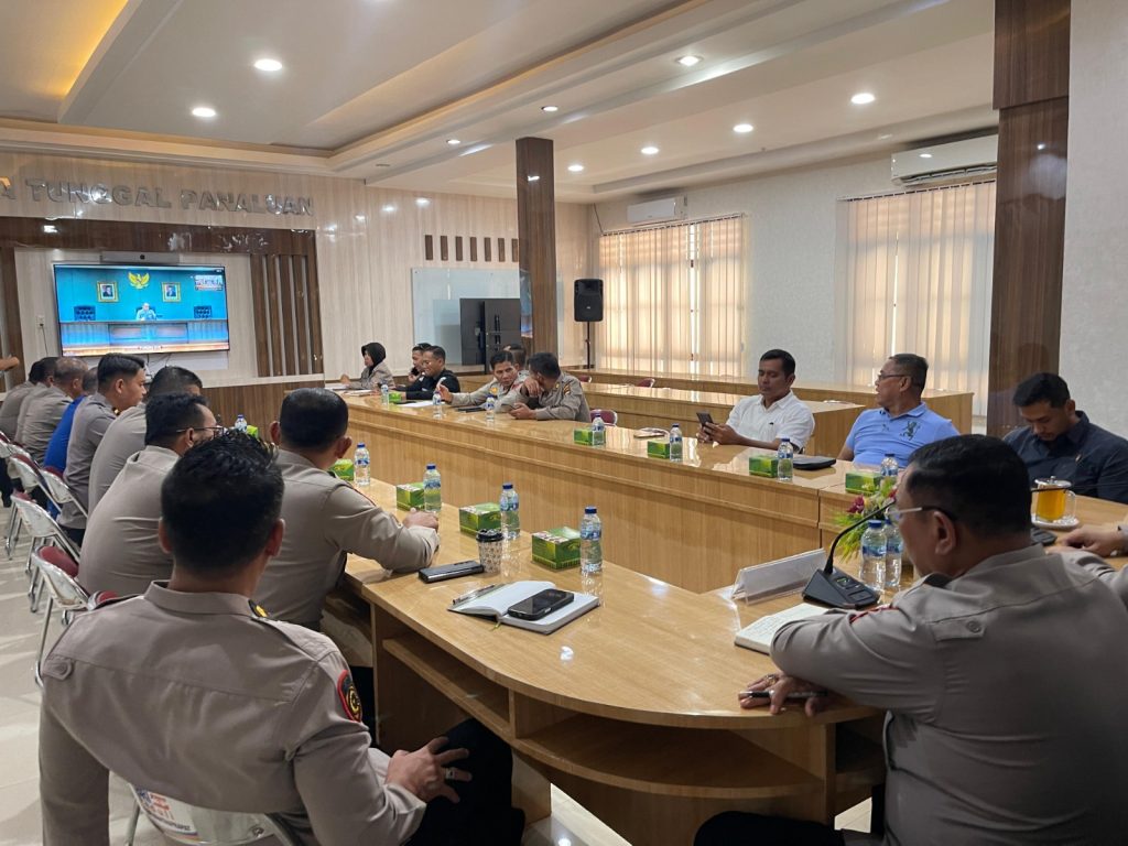 Labuhanbatu – Blusuk.online – Kapolres Labuhanbatu AKBP Choky Sentosa Meliala, S.I.K., S.H., M.H. bersama para Pejabat Utama (PJU) Polres Labuhanbatu mengikuti Zoom Meeting kesiapan menghadapi bencana di Aula Tunggal Panaluan Mapolres Labuhanbatu, Jalan M.H. Thamrin, Rantauprapat, Selasa (28/10/2025).