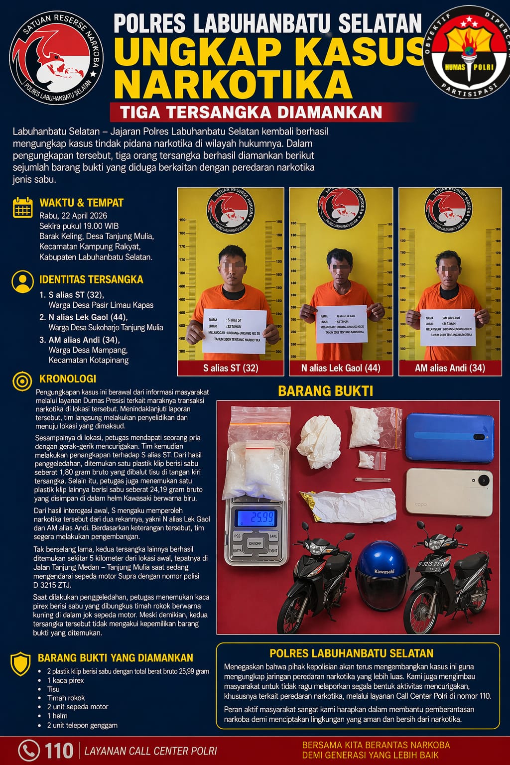 Ia juga mengimbau masyarakat untuk tidak ragu melaporkan segala bentuk aktivitas mencurigakan, khususnya terkait peredaran narkotika, melalui layanan Call Center Polri di nomor 110.