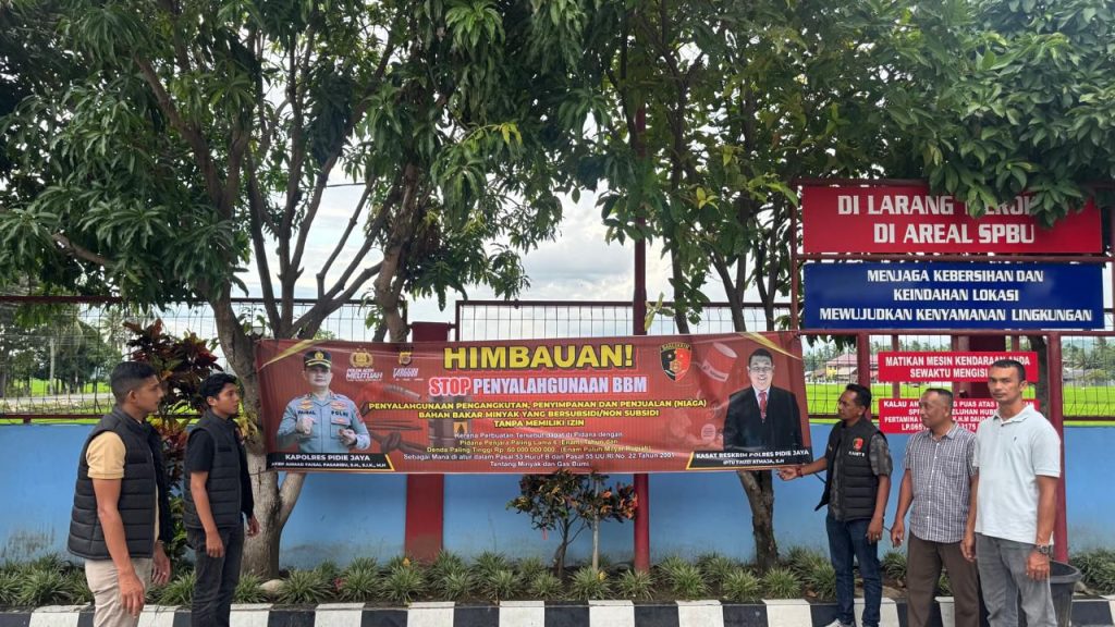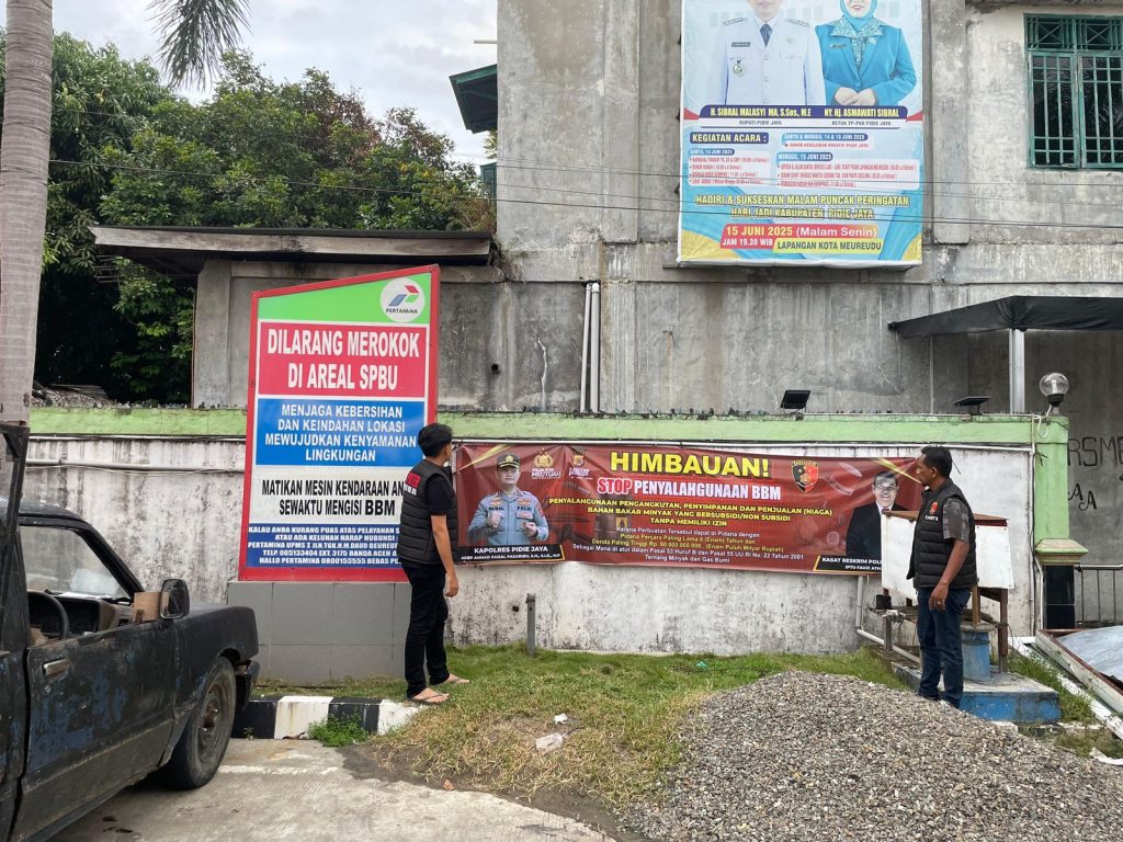 PIDIE JAYA , blusuk online– Polres Pidie Jaya melalui Unit II Tipidter Sat Reskrim melakukan langkah pencegahan penyalahgunaan Bahan Bakar Minyak (BBM) bersubsidi maupun non-subsidi dengan memasang spanduk dan menyampaikan surat himbauan di sejumlah Stasiun Pengisian Bahan Bakar Umum (SPBU), Sabtu (27/9/2025).