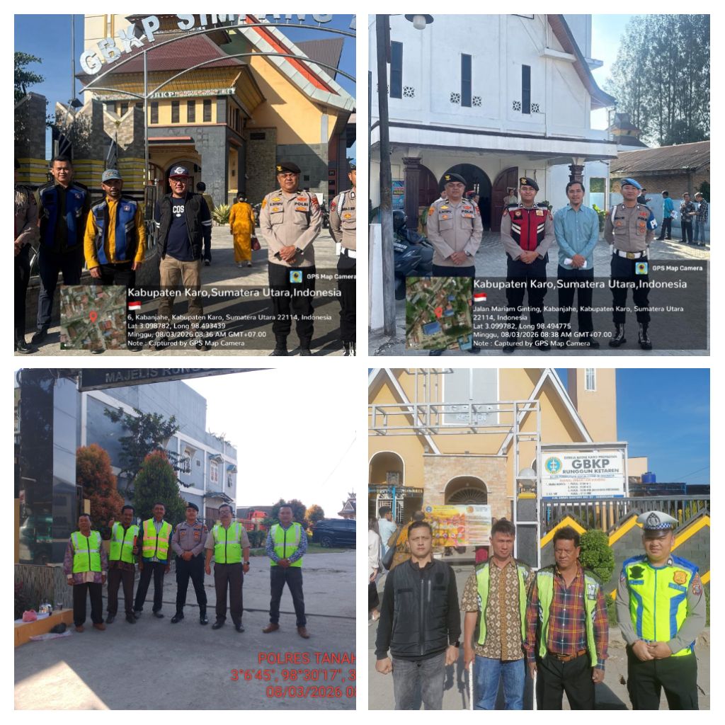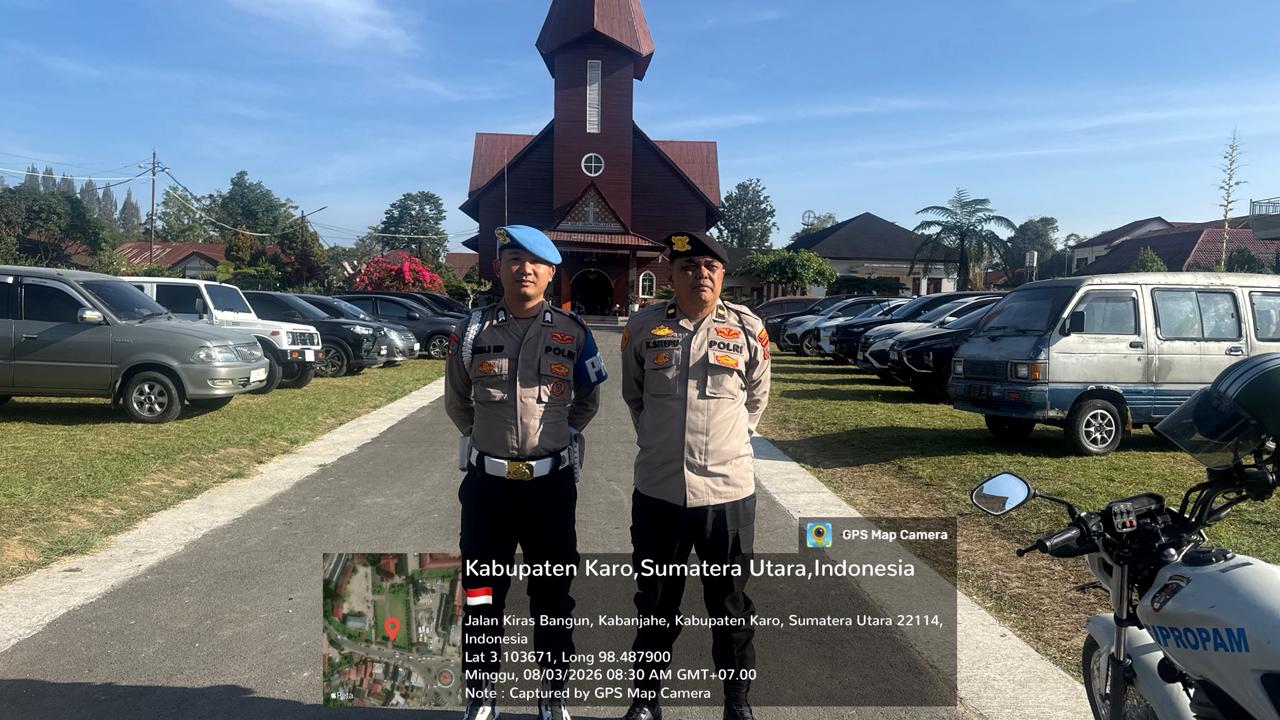 Karo – Blusuk.online – Dalam rangka memastikan keamanan dan kelancaran pelaksanaan ibadah Minggu bagi umat Kristiani, personel Polres Tanah Karo melaksanakan pengecekan terhadap personel yang bertugas melakukan pengamanan di sejumlah gereja di seputaran Kota Kabanjahe, Minggu (08/03/2026) sekira pukul 08.30 WIB hingga selesai.