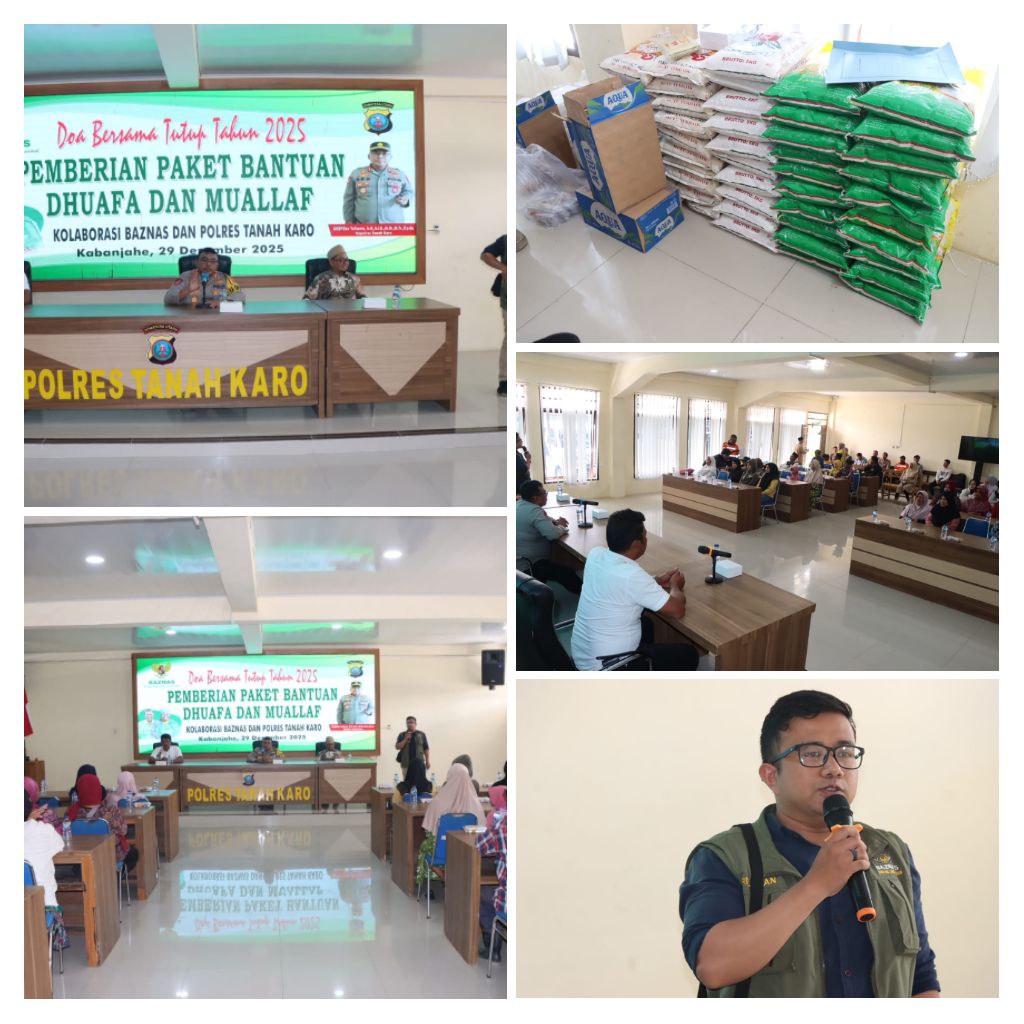 Kegiatan berlangsung pada Senin (29/12/2025) sekitar pukul 13.00 WIB di Aula Pur Pur Sage Mapolres Tanah Karo, bekerja sama dengan Badan Amil Zakat Nasional (Baznas) Kabupaten Karo.