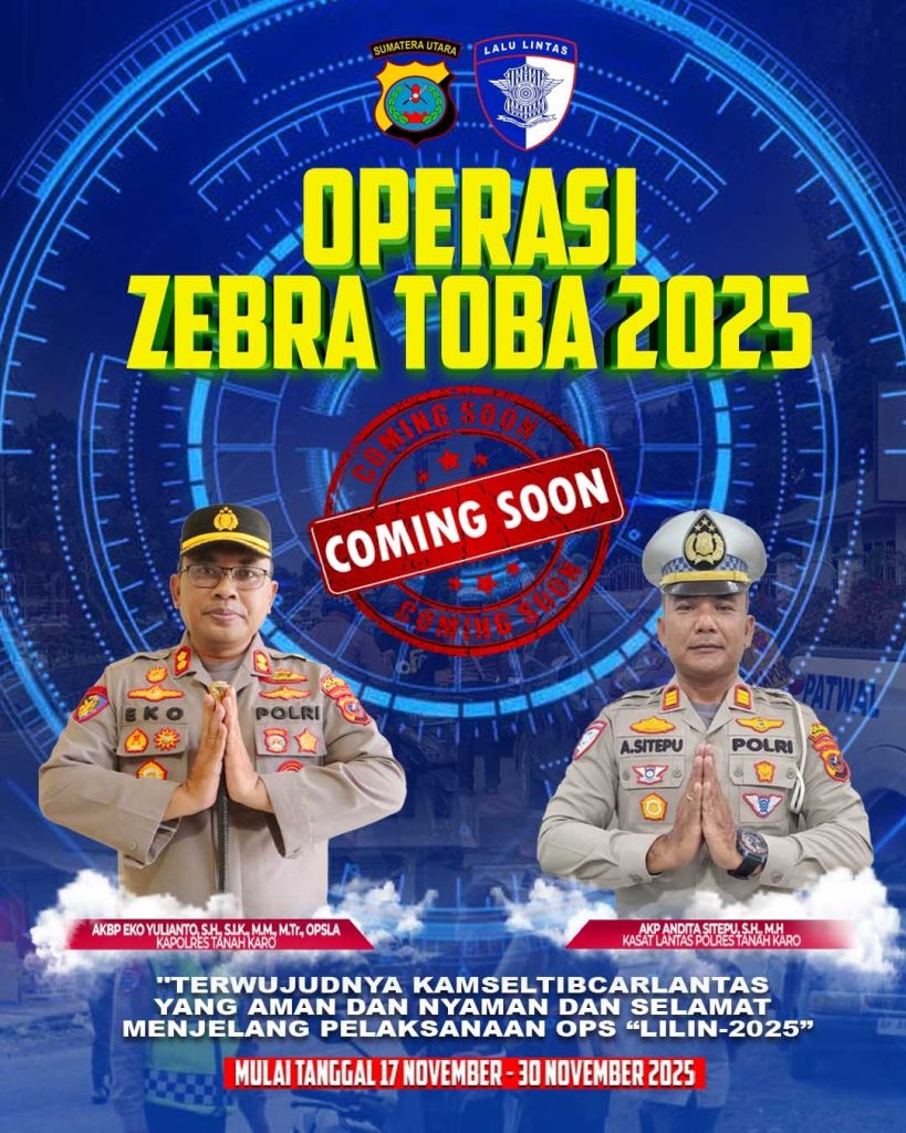 Blusuk.online – Polres Tanah Karo akan melaksanakan Operasi Zebra Toba 2025 mulai 17 hingga 30 November 2025. Kegiatan ini diarahkan untuk meningkatkan disiplin berlalu lintas dan menjamin keselamatan masyarakat di jalan, sekaligus menciptakan situasi yang kondusif menjelang Operasi Lilin 2025.