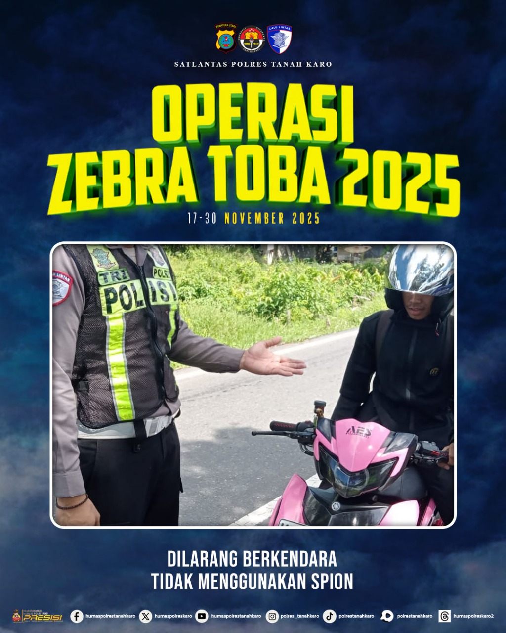 Polres Tanah Karo menegaskan bahwa kesadaran dan kedisiplinan berkendara merupakan kunci utama dalam menciptakan situasi lalu lintas yang aman dan tertib. Melalui Operasi Zebra Toba 2025, petugas akan melakukan pengawasan dan penindakan terhadap berbagai pelanggaran, termasuk kendaraan yang tidak dilengkapi spion standar.