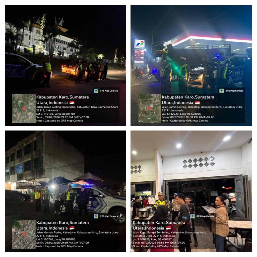 Karo – Blusuk.online – Guna menjaga situasi keamanan dan ketertiban masyarakat (kamtibmas) serta keselamatan, ketertiban, dan kelancaran lalu lintas (kamseltibcar lantas), Polres Tanah Karo melaksanakan patroli malam secara mobile dan stasioner pada Senin malam (9/2/2026).
