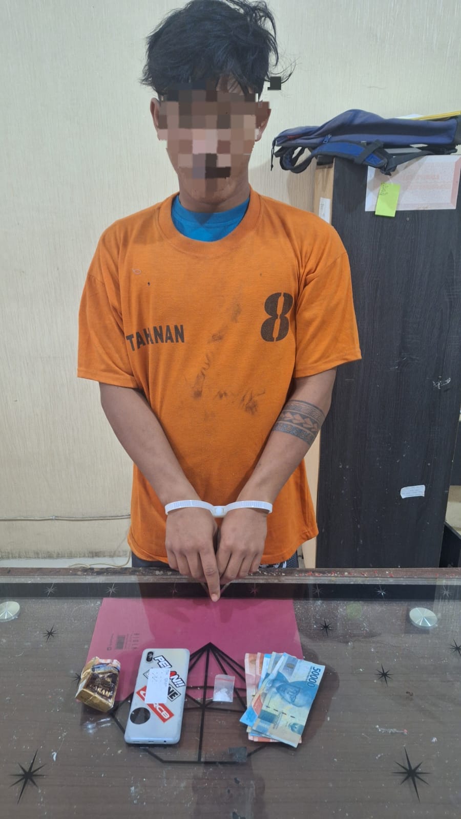 Dari hasil penggeledahan badan dan lokasi penangkapan, polisi mengamankan satu paket plastik klip berles merah yang diduga berisi narkotika jenis sabu dengan berat netto 0,44 gram, satu bungkus rokok Gudang Garam Surya, uang tunai sebesar Rp400.000 yang diduga hasil penjualan narkotika, serta satu unit handphone Android merek Samsung warna putih.