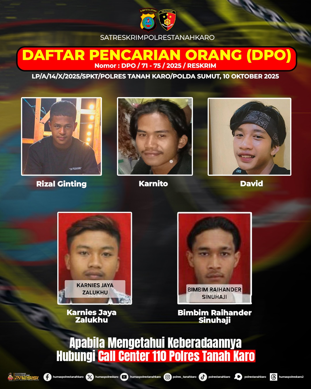 Melalui imbauan resminya, Polres Tanah Karo meminta masyarakat menghubungi Call Center 110 jika memiliki informasi terkait kelima DPO tersebut. Kapolres Tanah Karo berharap dukungan masyarakat dapat membantu proses penangkapan sehingga situasi keamanan dan ketertiban di wilayah Kabupaten Karo tetap terjaga.