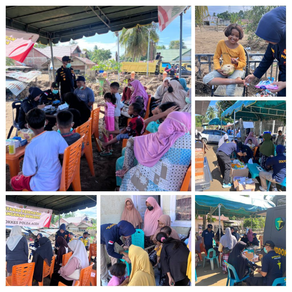 Kegiatan ini meliputi pemeriksaan kesehatan, pemberian obat-obatan, dan edukasi kesehatan untuk memastikan kondisi fisik pengungsi tetap terjaga selama masa pemulihan. Tim medis yang terlibat antara lain IPTU dr. Riska, Tim Biddokes Polda Aceh, dokter mitra Klinik Polres Pidie Jaya, serta tenaga kesehatan Polres Pidie Jaya.
