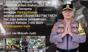 Melalui Operasi Ketupat Toba 2026, Polres Tanah Karo juga mengimbau kepada seluruh pengendara agar selalu berhati-hati, mematuhi peraturan lalu lintas, serta menjaga kondisi fisik agar tetap prima selama perjalanan.