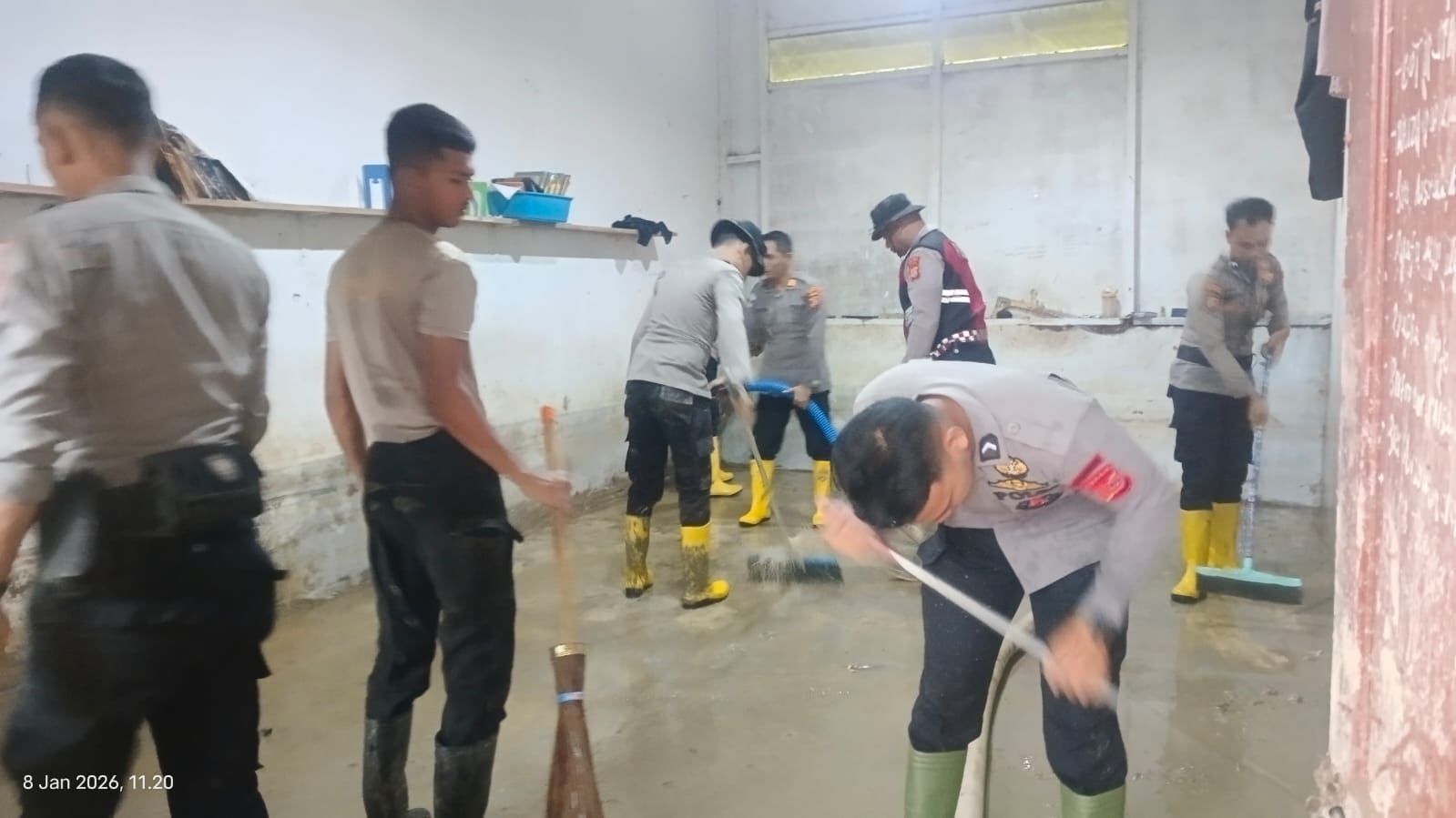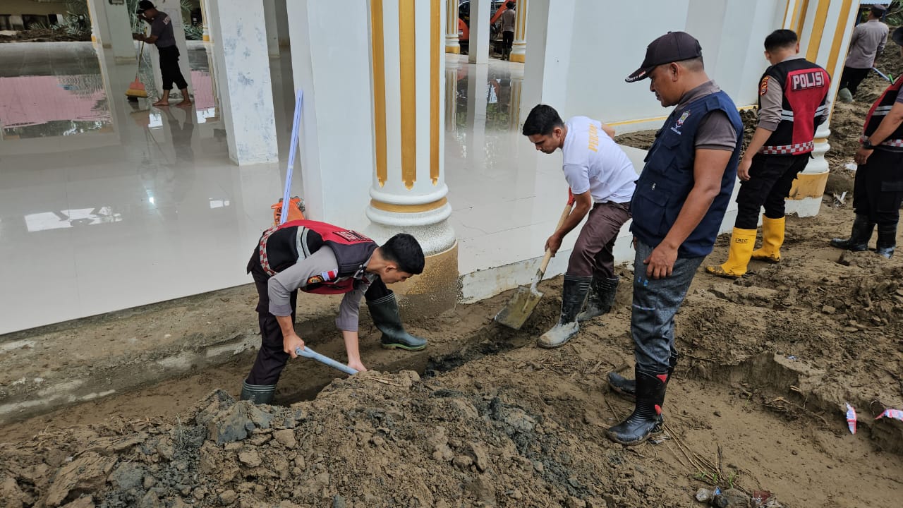 Dalam kegiatan tersebut, personel Polri bersama masyarakat membersihkan sejumlah lokasi terdampak, di antaranya Asrama Putri Dayah Ummul Ayman, kamar mandi asrama, serta halaman musala Dayah Ummul Ayman yang berada di Gampong Meunasah Bie, Kecamatan Meurah Dua.