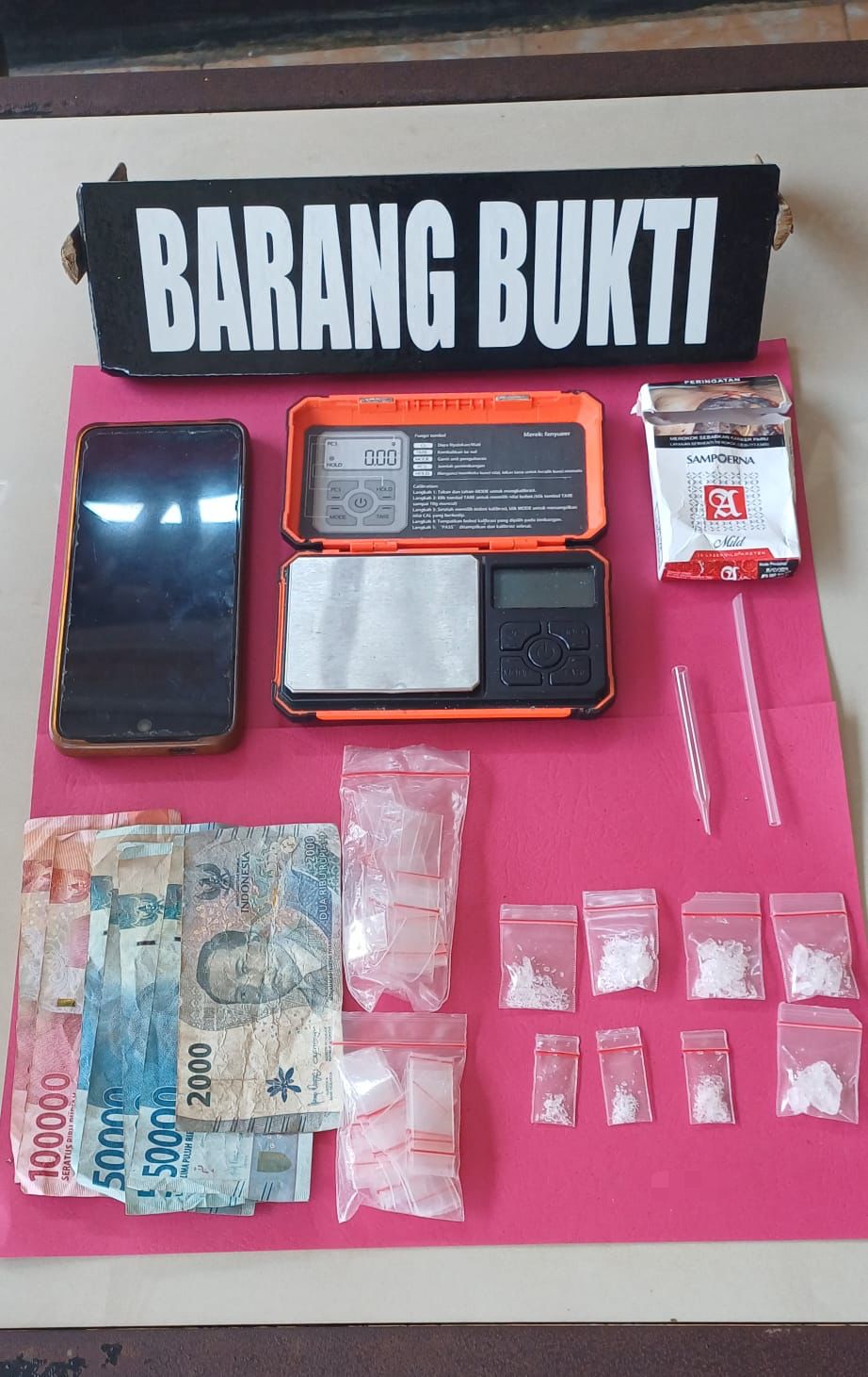 Adapun barang bukti yang diamankan berupa delapan bungkus plastik klip berisi narkotika jenis sabu dengan berat total sekitar 6,23 gram, satu unit timbangan elektrik, plastik klip kosong, kaca pirek, pipet skop, satu unit telepon genggam, uang tunai sebesar Rp402.000, serta dua unit sepeda motor.
