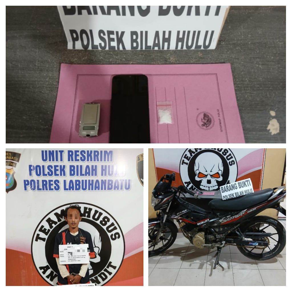 Labuhanbatu – Blusuk.online – Kepolisian Sektor Bilah Hulu, Polres Labuhanbatu, berhasil mengungkap kasus peredaran narkotika jenis sabu di wilayah hukumnya. Penangkapan dilakukan pada Jumat malam, 29 Agustus 2025 sekitar pukul 20.50 WIB di Dusun Persiluangan I, Desa Pematang Seleng, Kecamatan Bilah Hulu, Kabupaten Labuhanbatu.