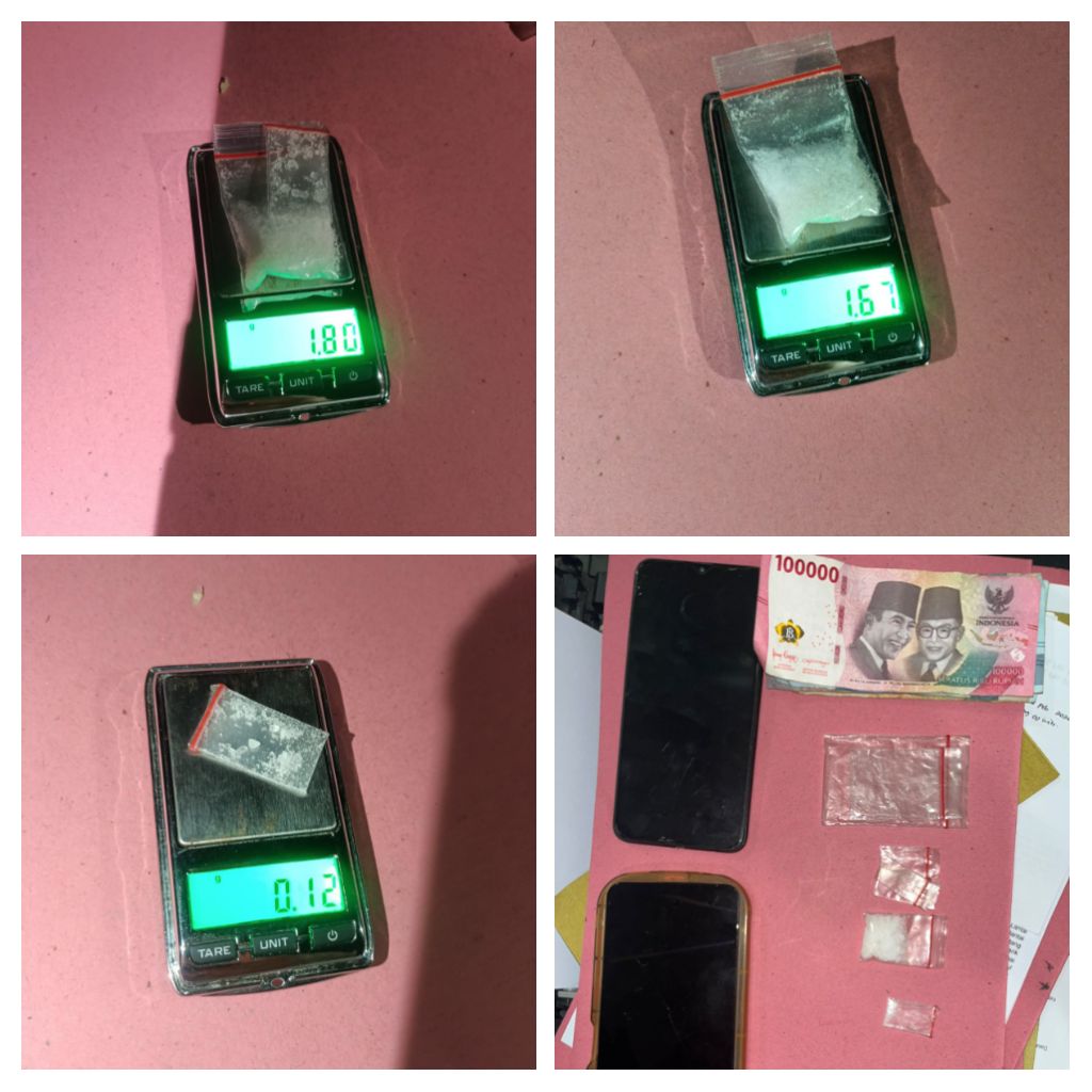 Dari hasil penggeledahan, ditemukan satu plastik klip transparan ukuran sedang berisi diduga sabu dengan berat bruto 1,67 gram yang disembunyikan di balik speaker kamar. Selain itu, ditemukan satu plastik klip kecil berisi diduga sabu seberat 0,12 gram bruto di kantong celana salah satu terlapor.