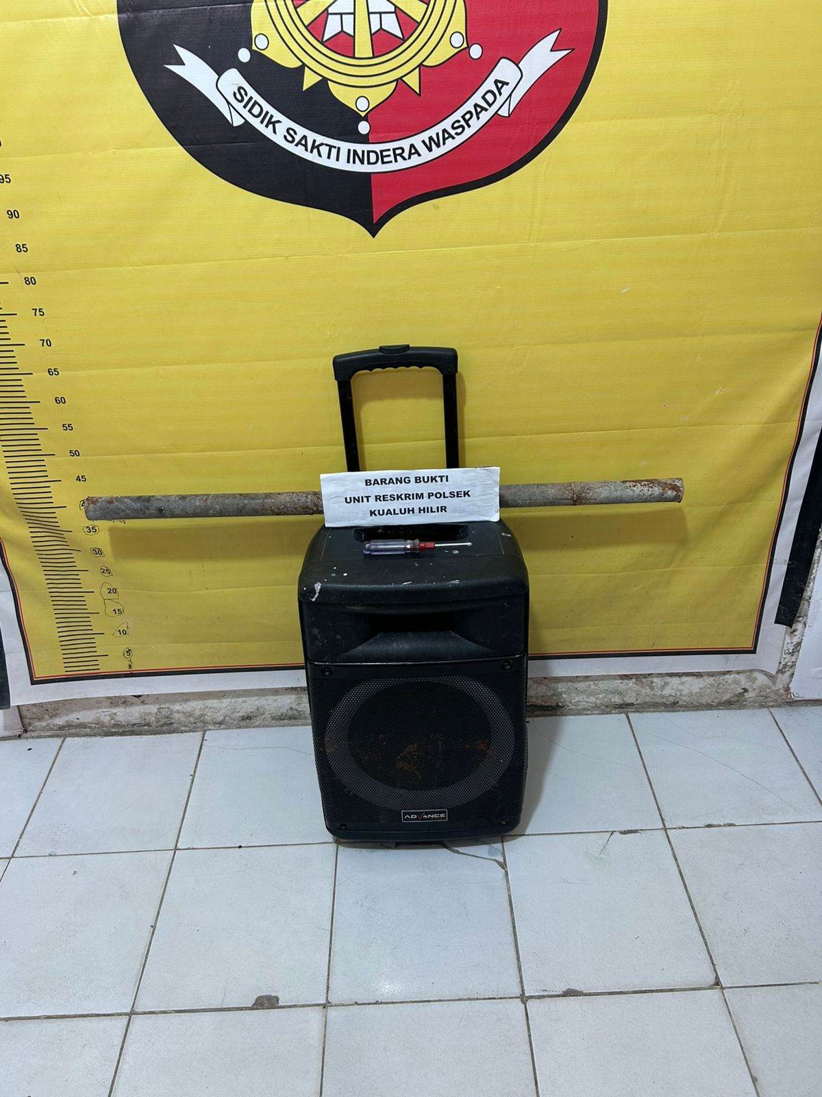 Dari tangan pelaku, petugas turut mengamankan sejumlah barang bukti berupa pipa besi, satu unit loudspeaker, serta obeng yang digunakan dalam aksi kejahatan.